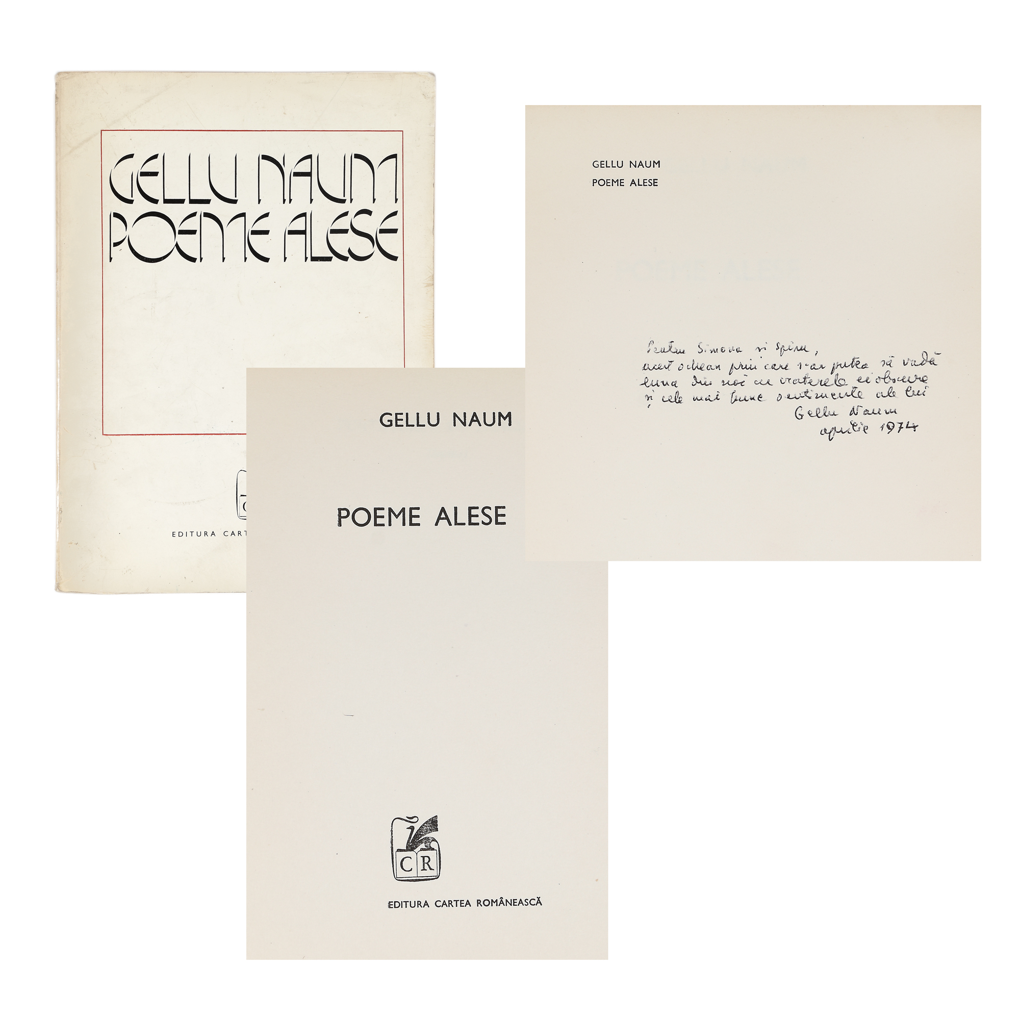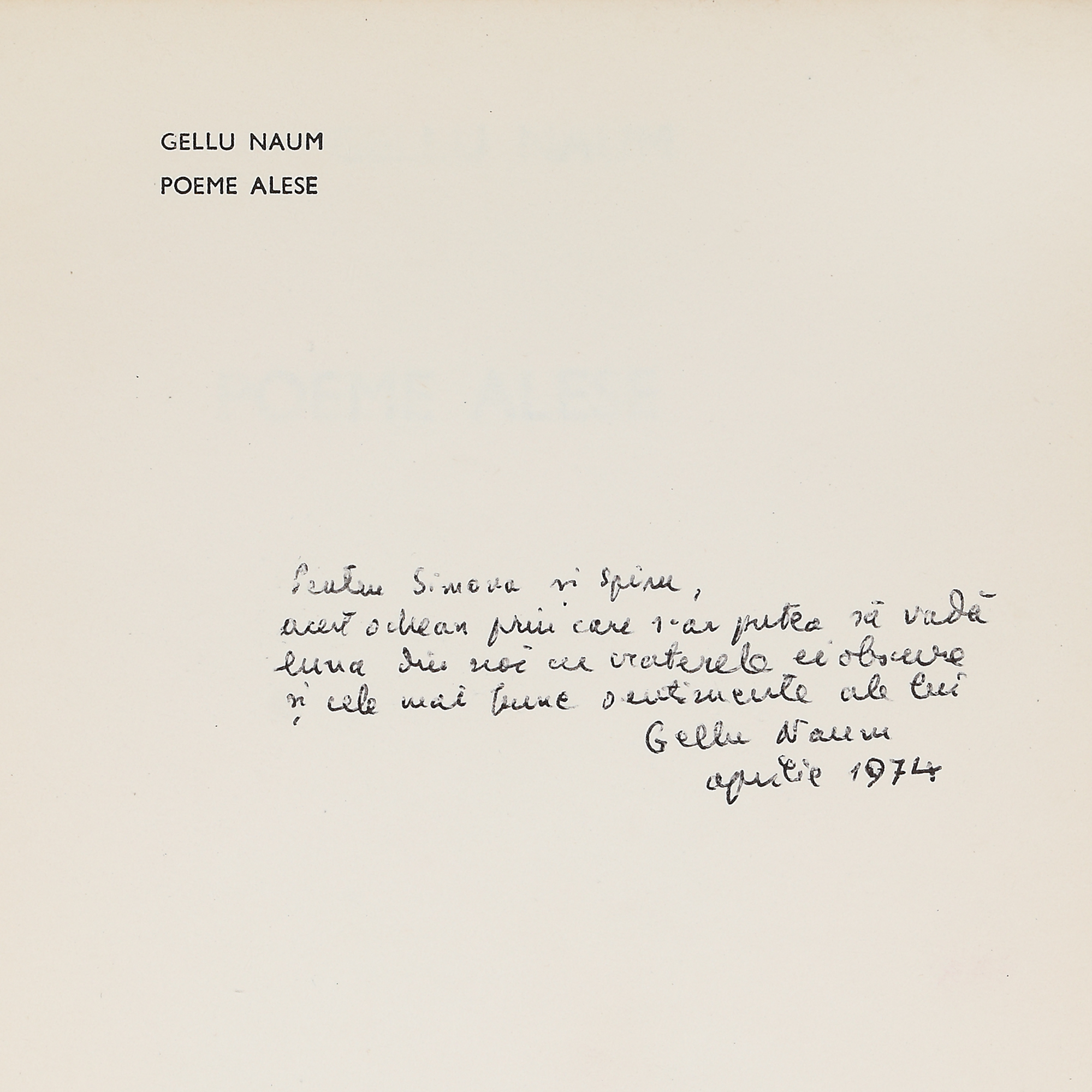 102. ”Poeme alese”, de Gellu Naum, București, 1974, cu dedicația autorului către familia Chintilă, provine din colecția familiei Spiru și Simona Chintilă