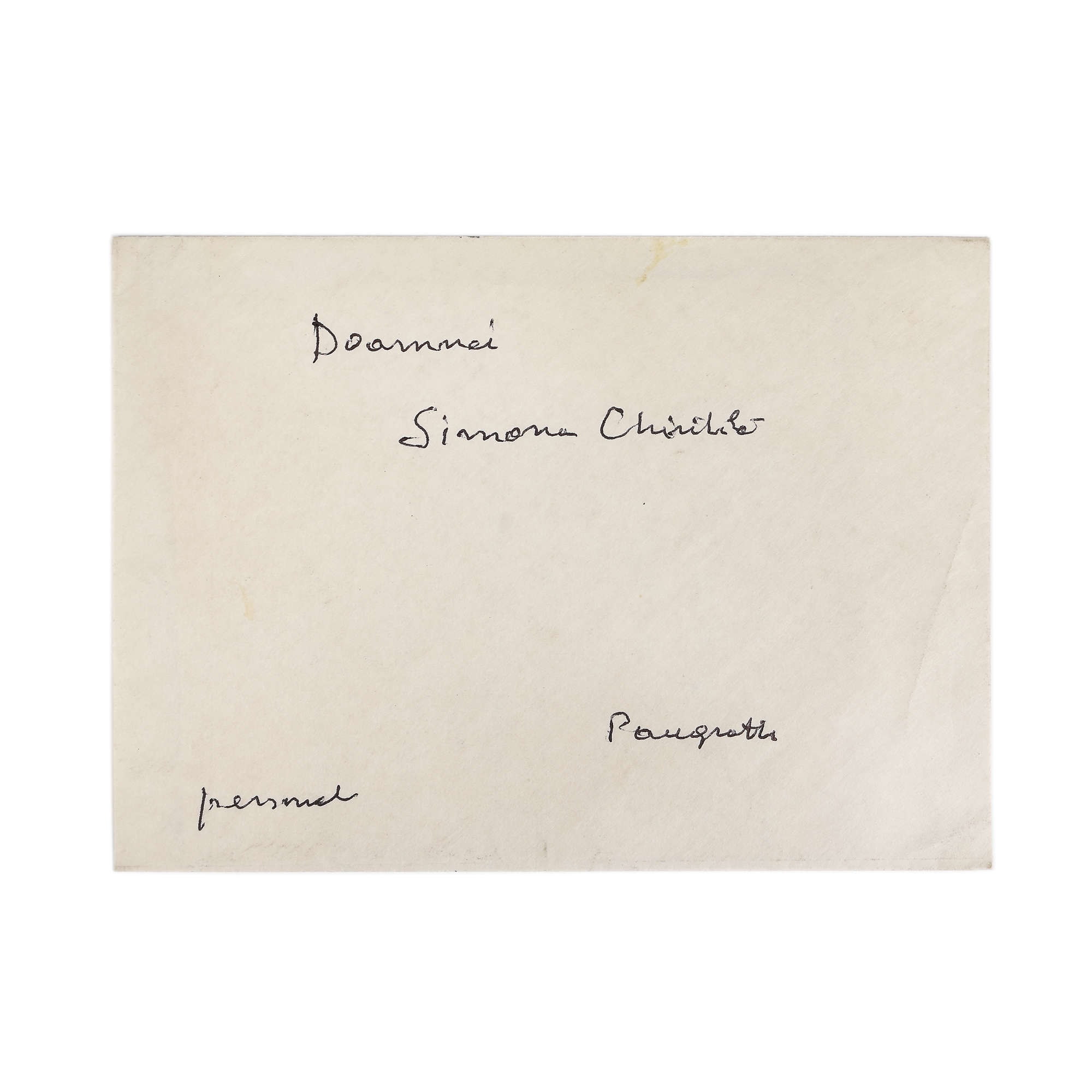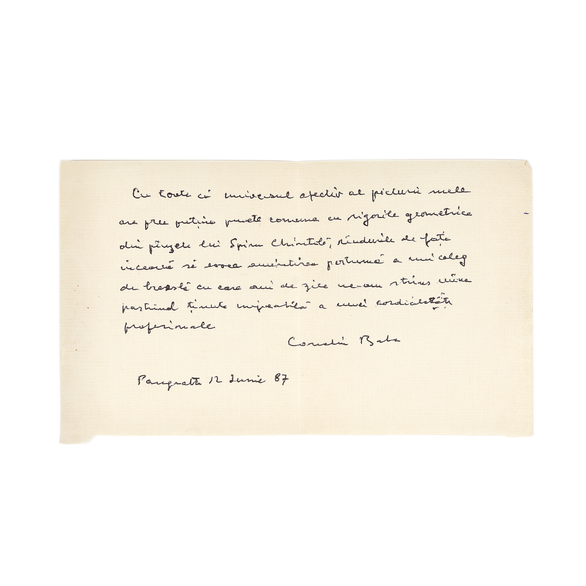 97. Scrisoare ”... universul afectiv al picturii mele...” trimisă de Corneliu Baba, din atelierul său situat în strada Pangrati, către Simona Chintilă, București, 12 iunie 1987, cu plic și semnătura lui Corneliu Baba (1 filă), provine din colecția familiei Spiru și Simona Chintilă