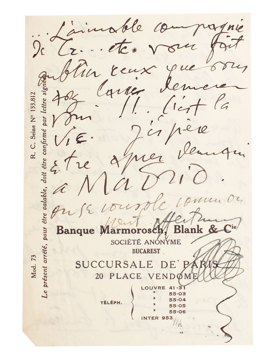 132. Bilet trimis de Theodor Pallady către Gheorghe Răut, pe o hârtie Banque Marmorosch, Blank & Cie, din călătoria în Spania, în anul 1928