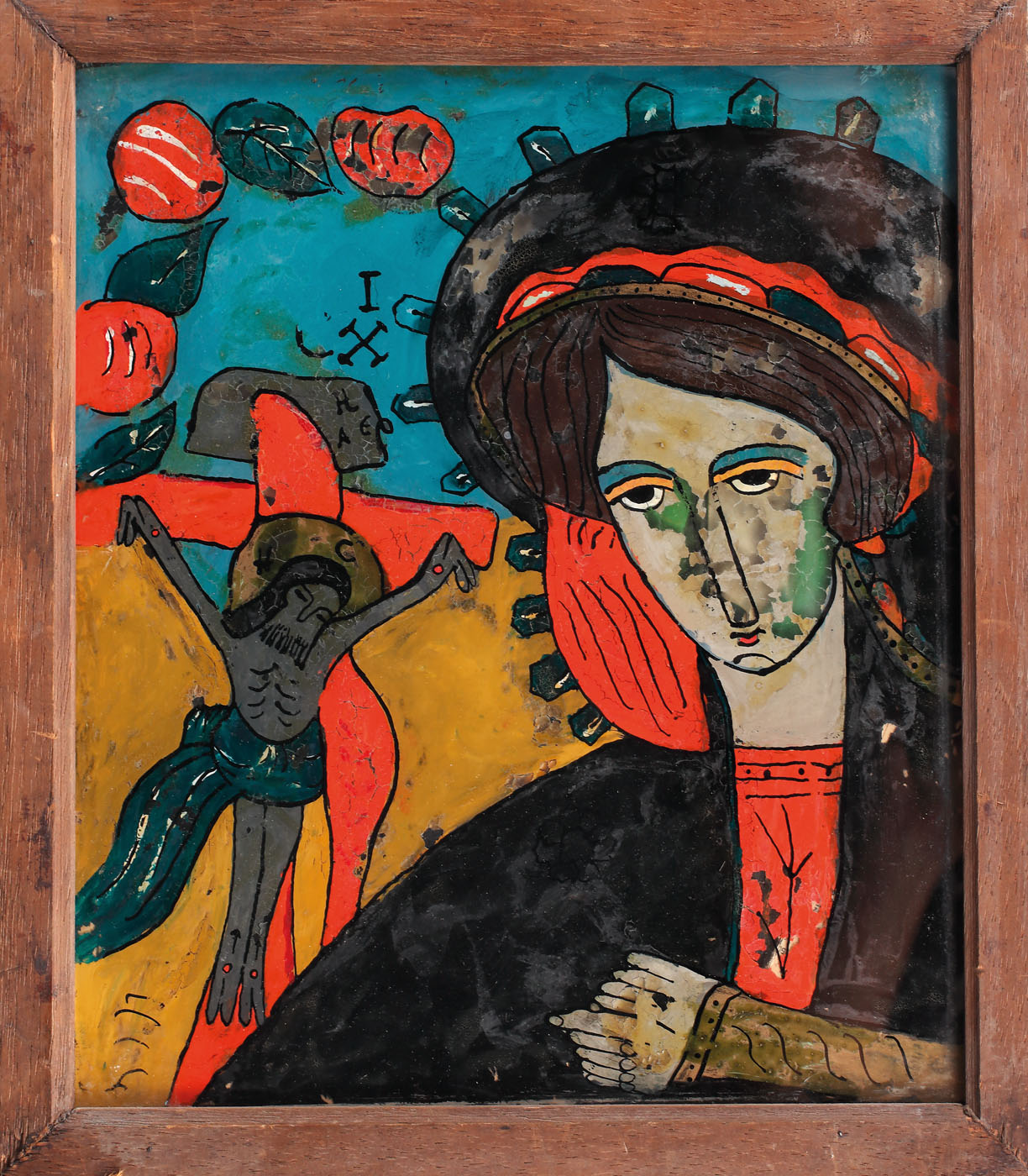 143. Icoană pe sticlă, "Maica Domnului îndurerată", atelier transilvănean, sfârşitul sec. XIX