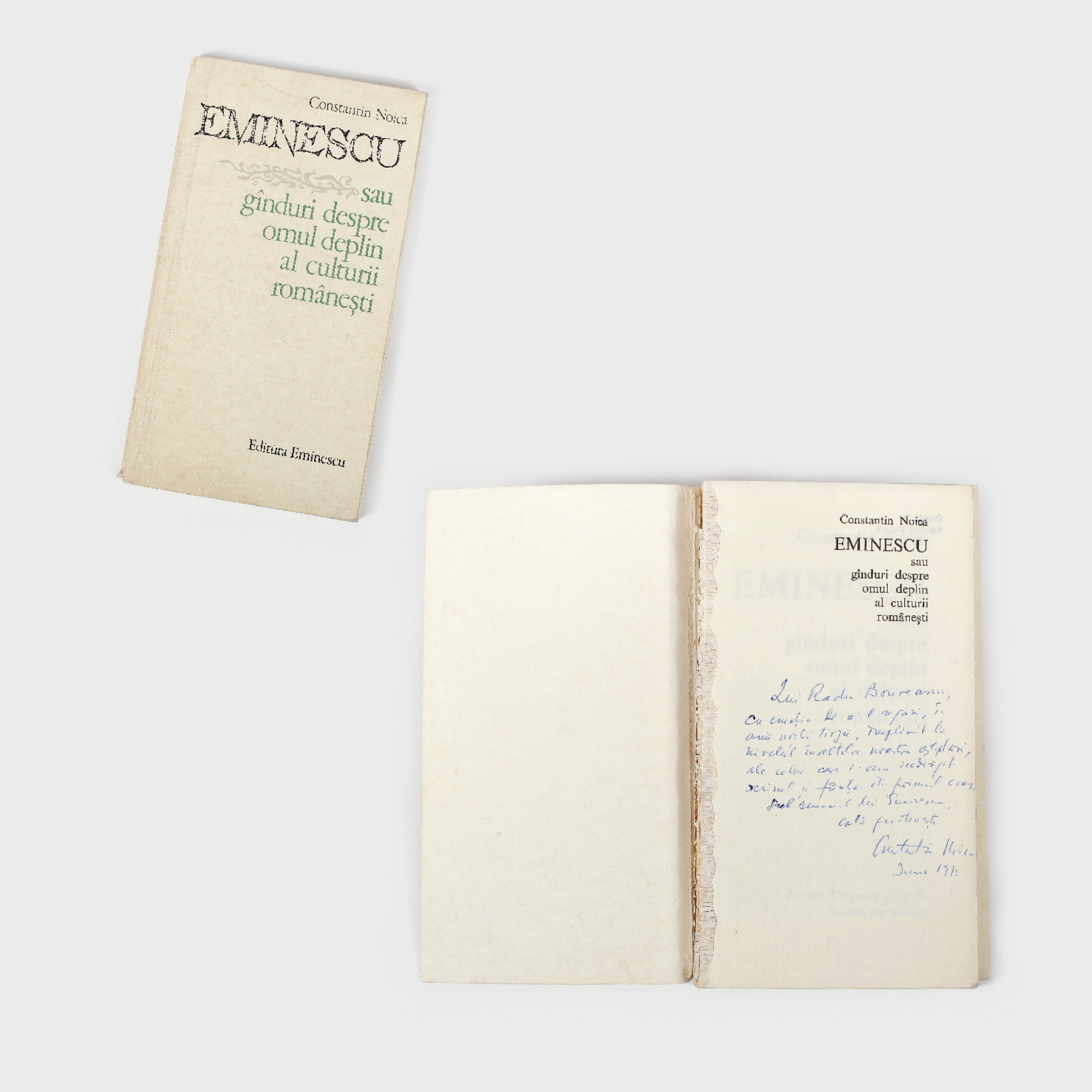 43. "Eminescu sau gânduri despre omul deplin al culturii românești", de Constantin Noica, București, 1975, cu semnătura și dedicația olografă a autorului