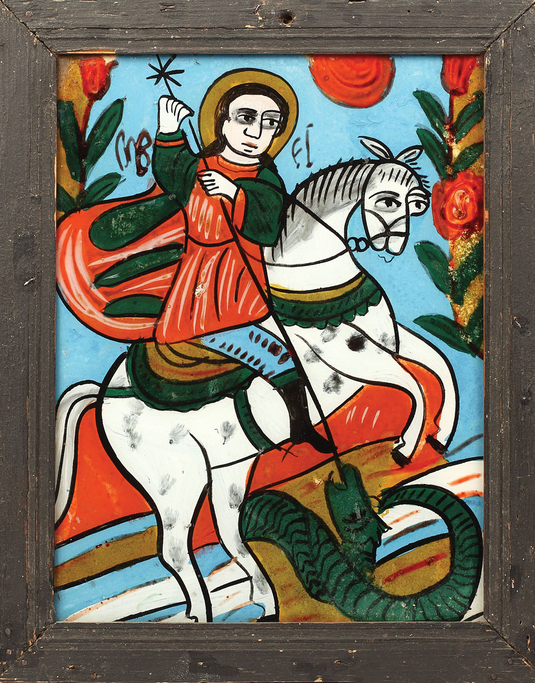 308. Icoană pe sticlă, Sf. Gheorghe omorând balaurul, zona Făgăraș, începutul sec. XX, ce a aparținut violoncelistului Cătălin Ilea