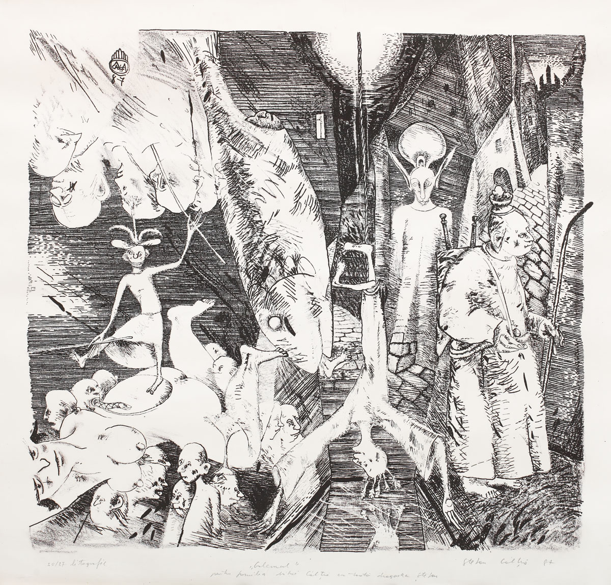 semnat şi datat dreapta jos, în creion, Ştefan Câlţia, (19)87; intitulat şi dedicat central jos, în creion, "Golemul", pentru familia Mihai Câlţia cu toată dragostea, Ştefan; numerotat stânga jos, în creion, 20/27