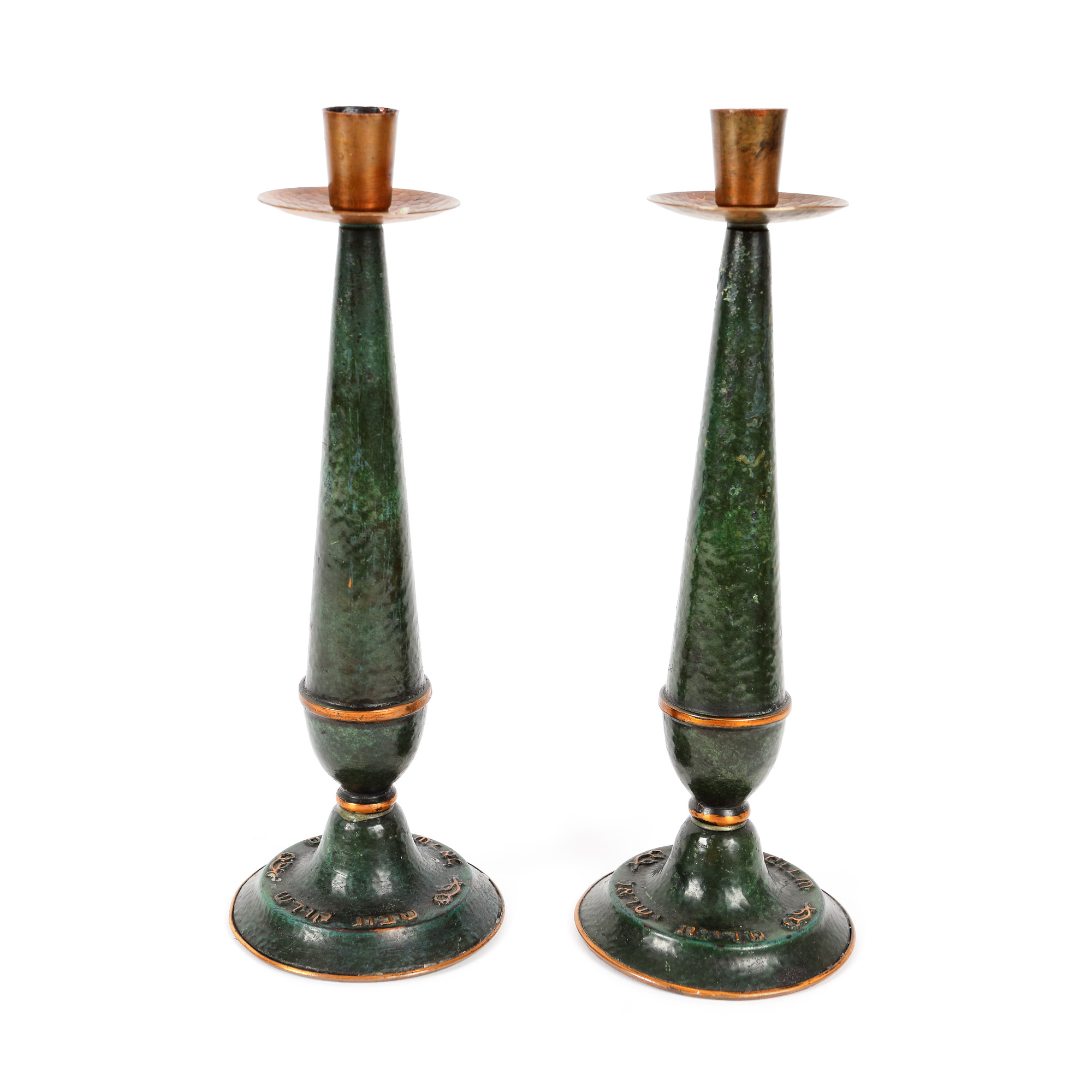 91. Pereche de sfeșnice din alamă emailată, pentru Shabbat, purtând inscripții în ebraică [a doua jumătate a sec. XX]
