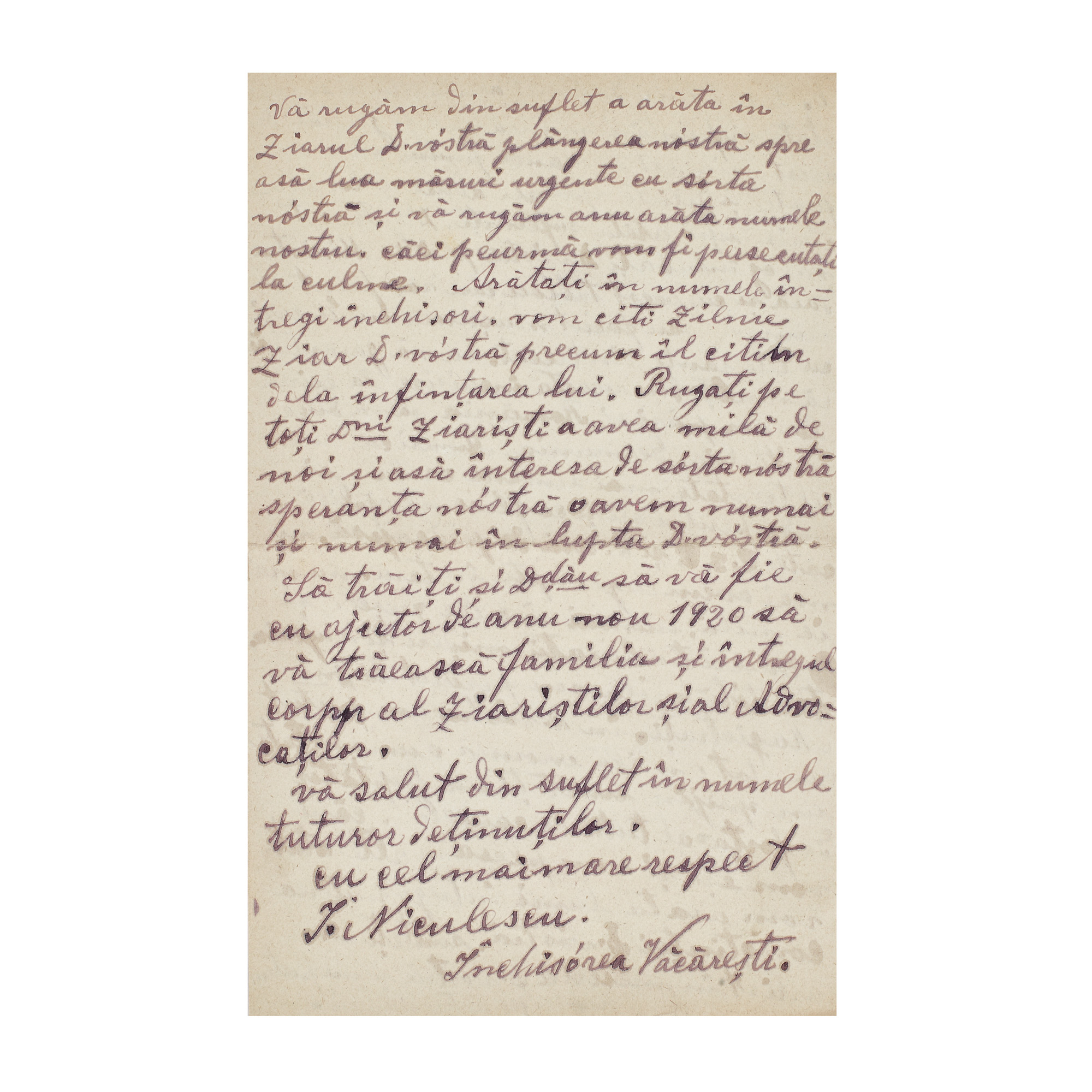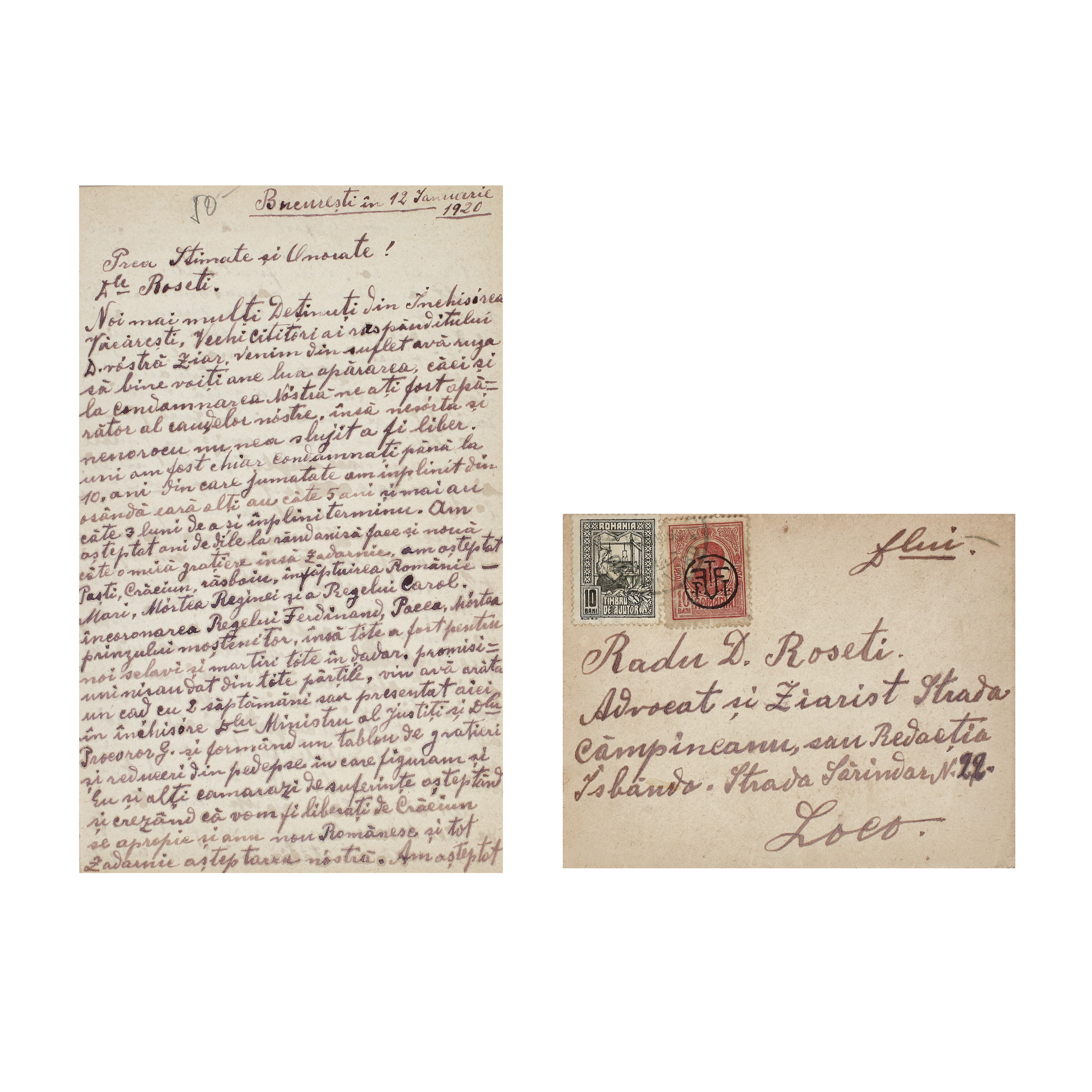 118. Scrisoare ”Noi, mai mulți deținuți din închisoarea Văcărești...” trimisă de I. Niculescu către avocatul Radu D. Rosetti, București, 12 ianuarie 1920, cu plicul original