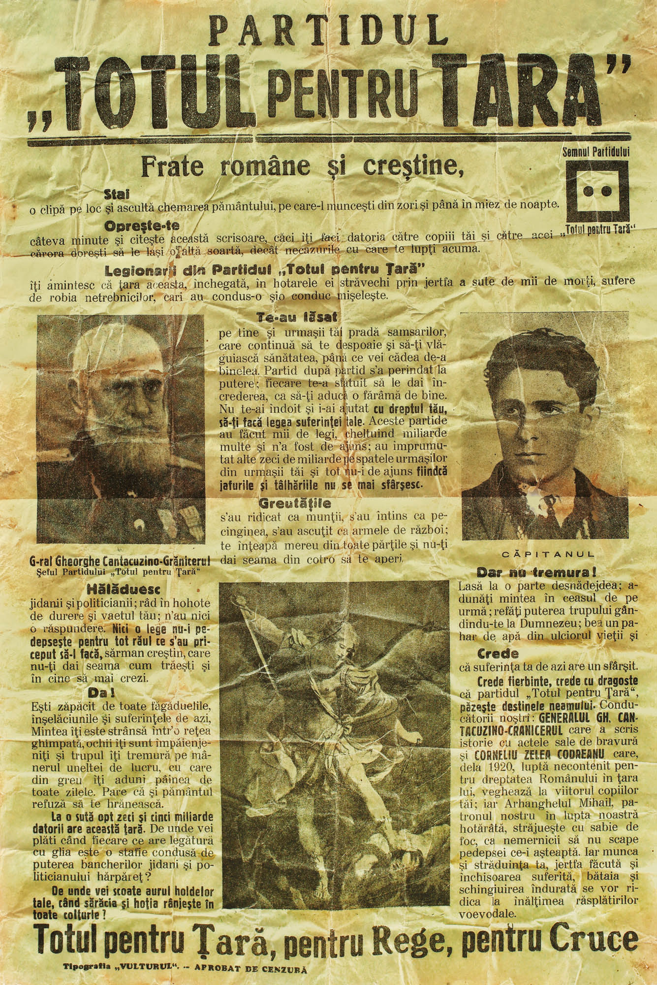 260. Afiş de propagandă al partidului "Totul Pentru Ţară", piesă extrem de rară
