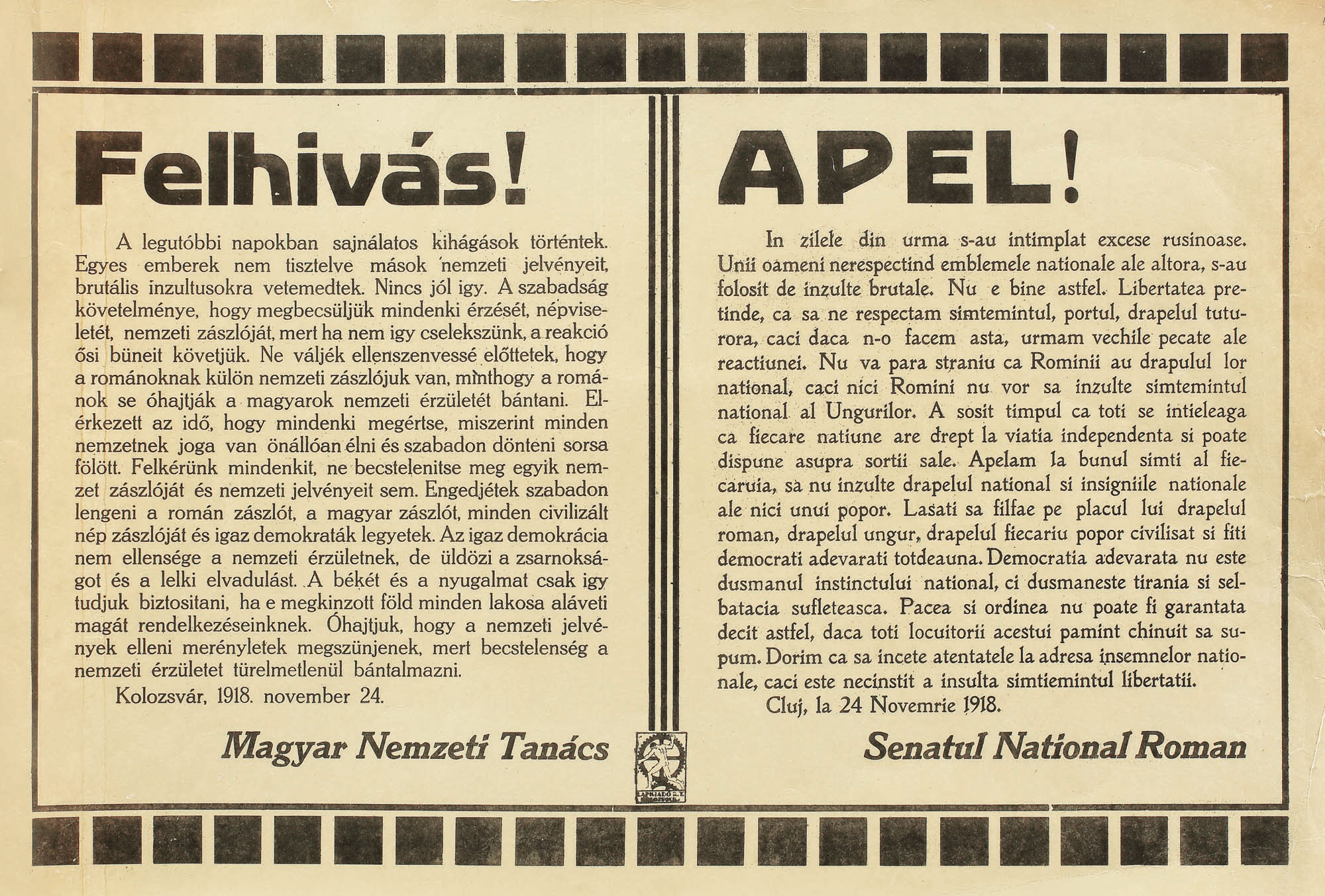 262. Afiş în limba română şi maghiară, "Apel" la încetarea vandalismului împotriva drapelului naţional, 1918, piesă rară de colecţie