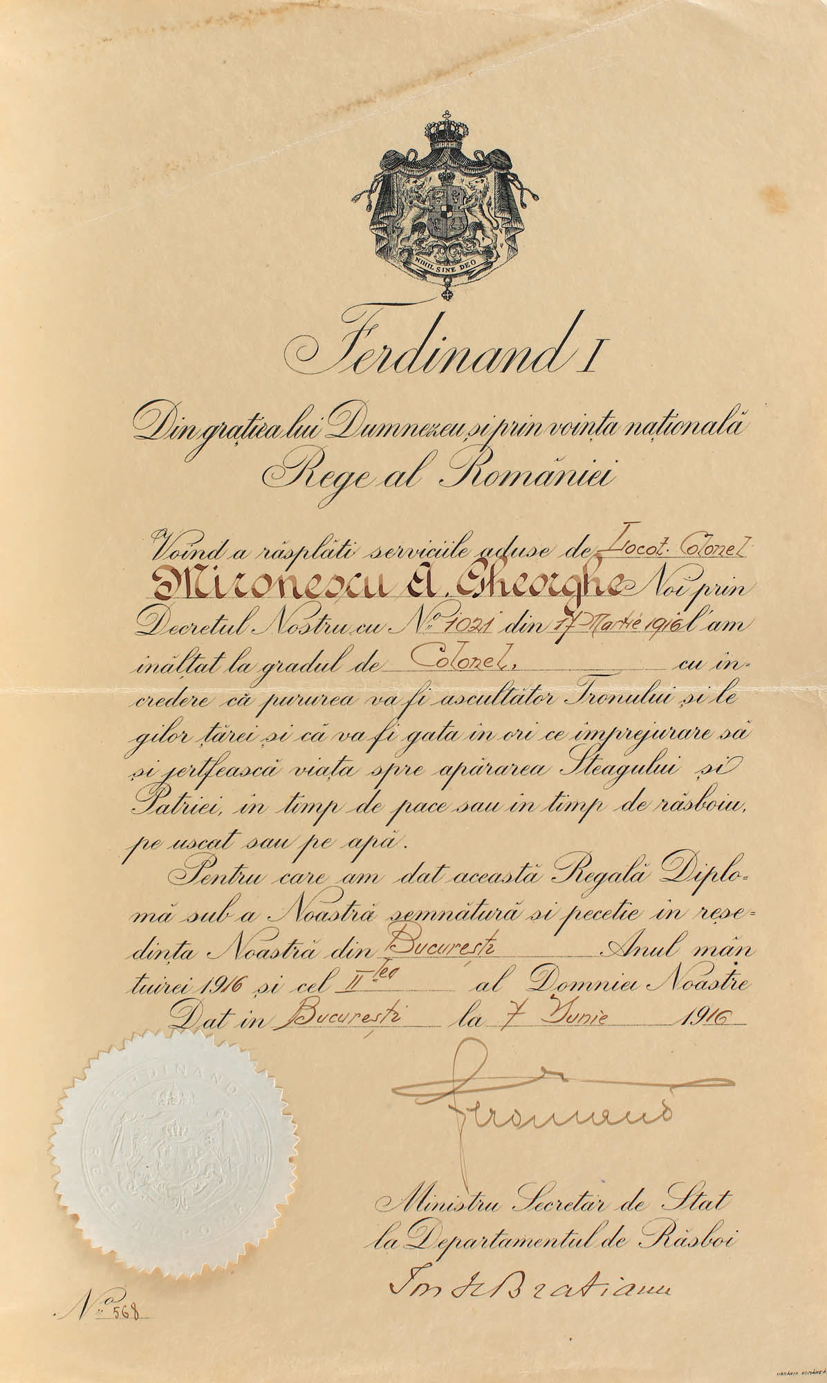 193. Diplomă Regală de înălțare în grad a unui ofițer din armata română, purtând semnătura olografă și sigiliul Regelui Ferdinand I
