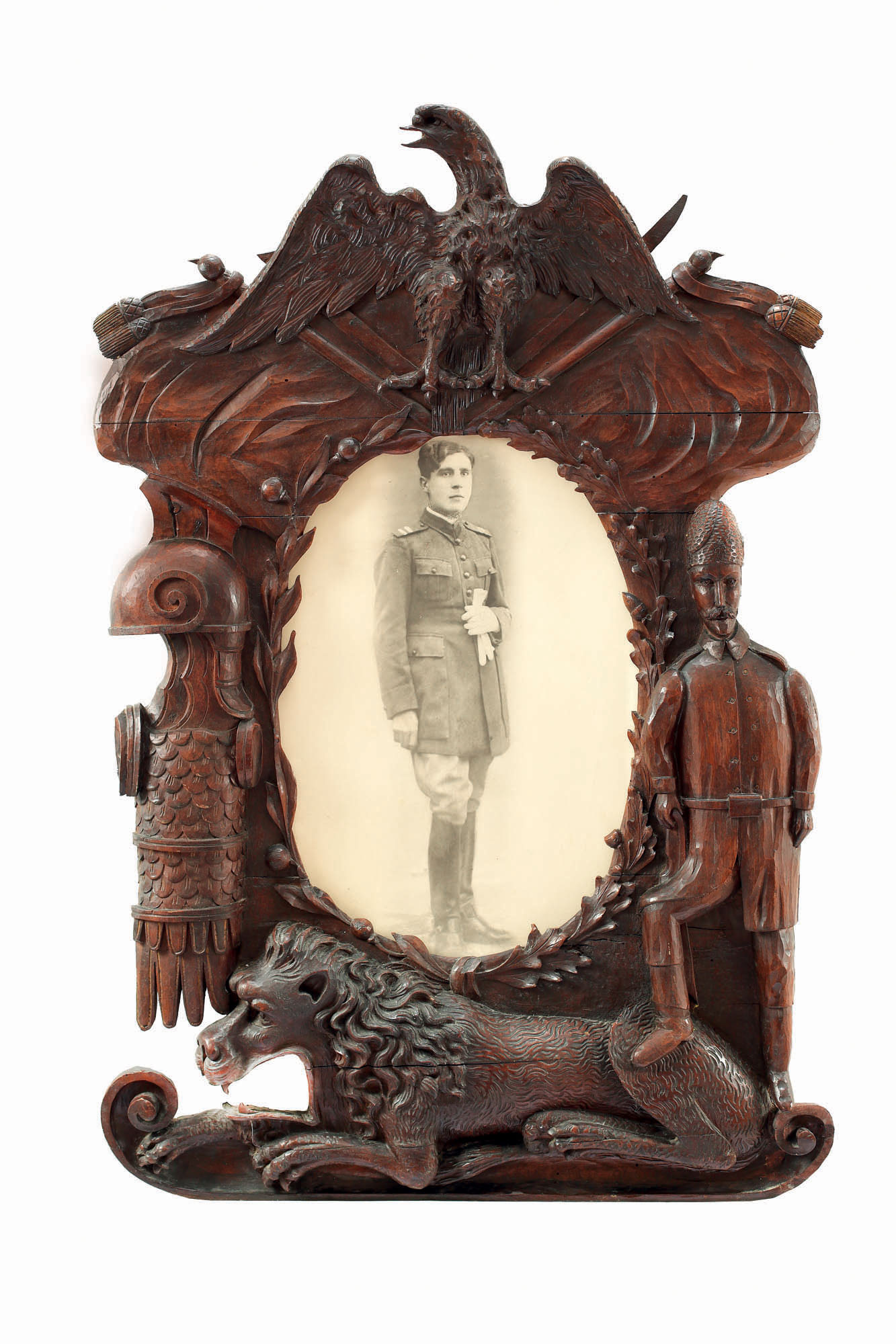 231. Forografie surprinzând un locotenent din perioada Regelui Carol II, cu ramă sculptată în lemn de nuc