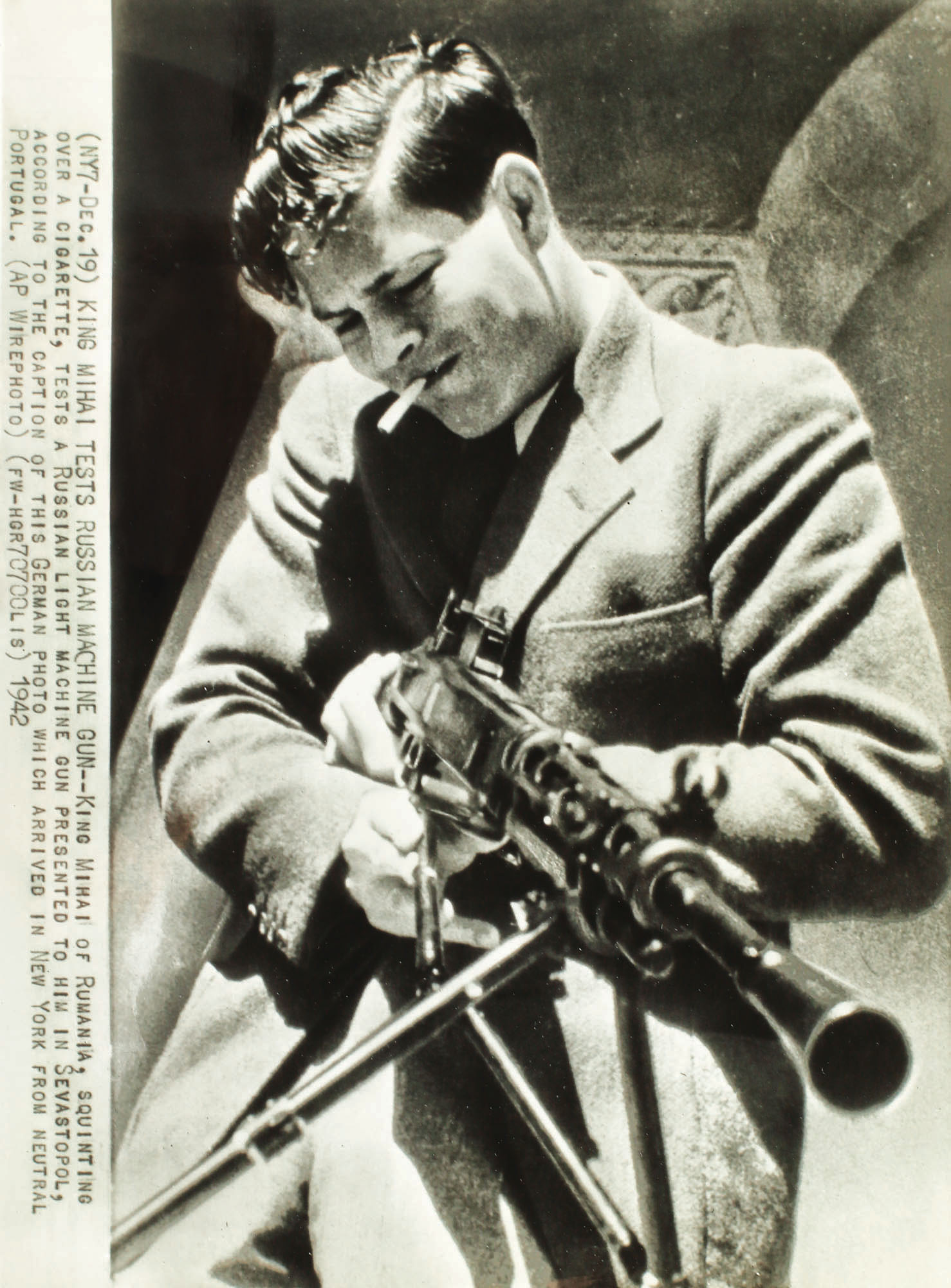 234. Fotografie de presă surprinzându-l pe M.S. Regele Mihai I încercând o mitralieră rusească, 1941