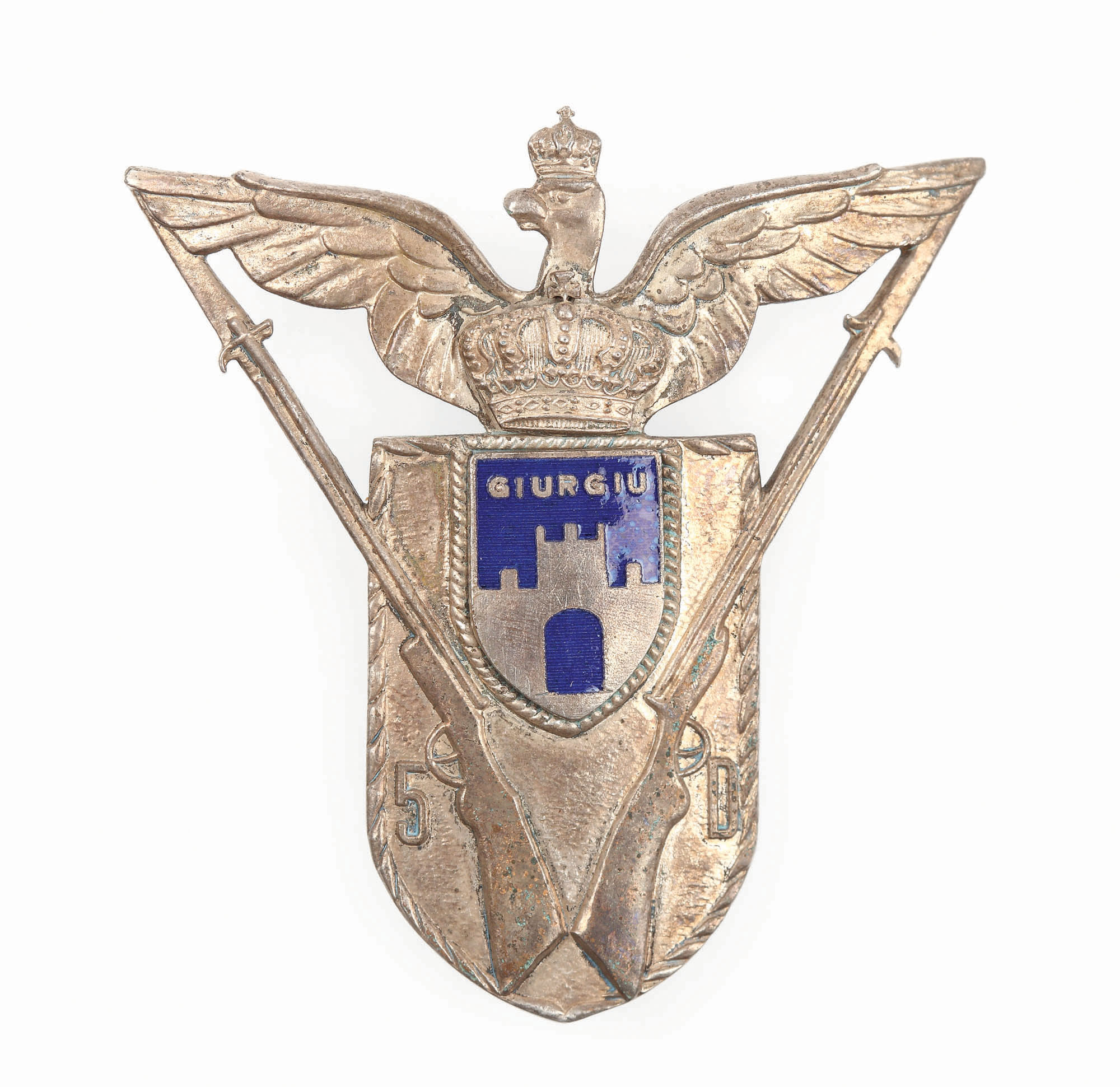 213. Insigna de 7 ani a "Regimentului 5 dorobanți", ce a avut sediul unitații în Vlașca, piesă rară