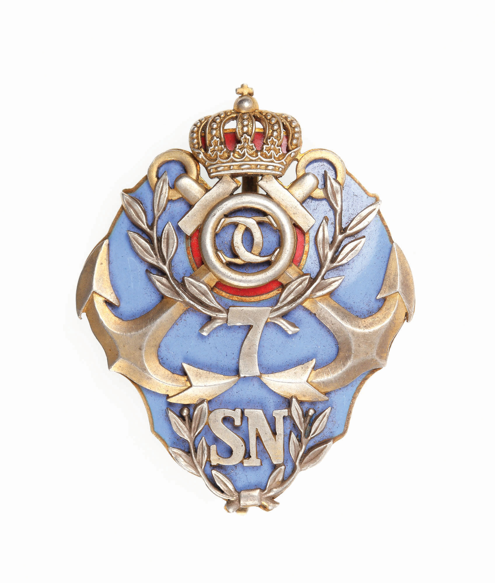 216. Insigna din argint, de 7 ani a "Școlii Navale", ce a avut sediul în Constanța, piesă extrem de rară