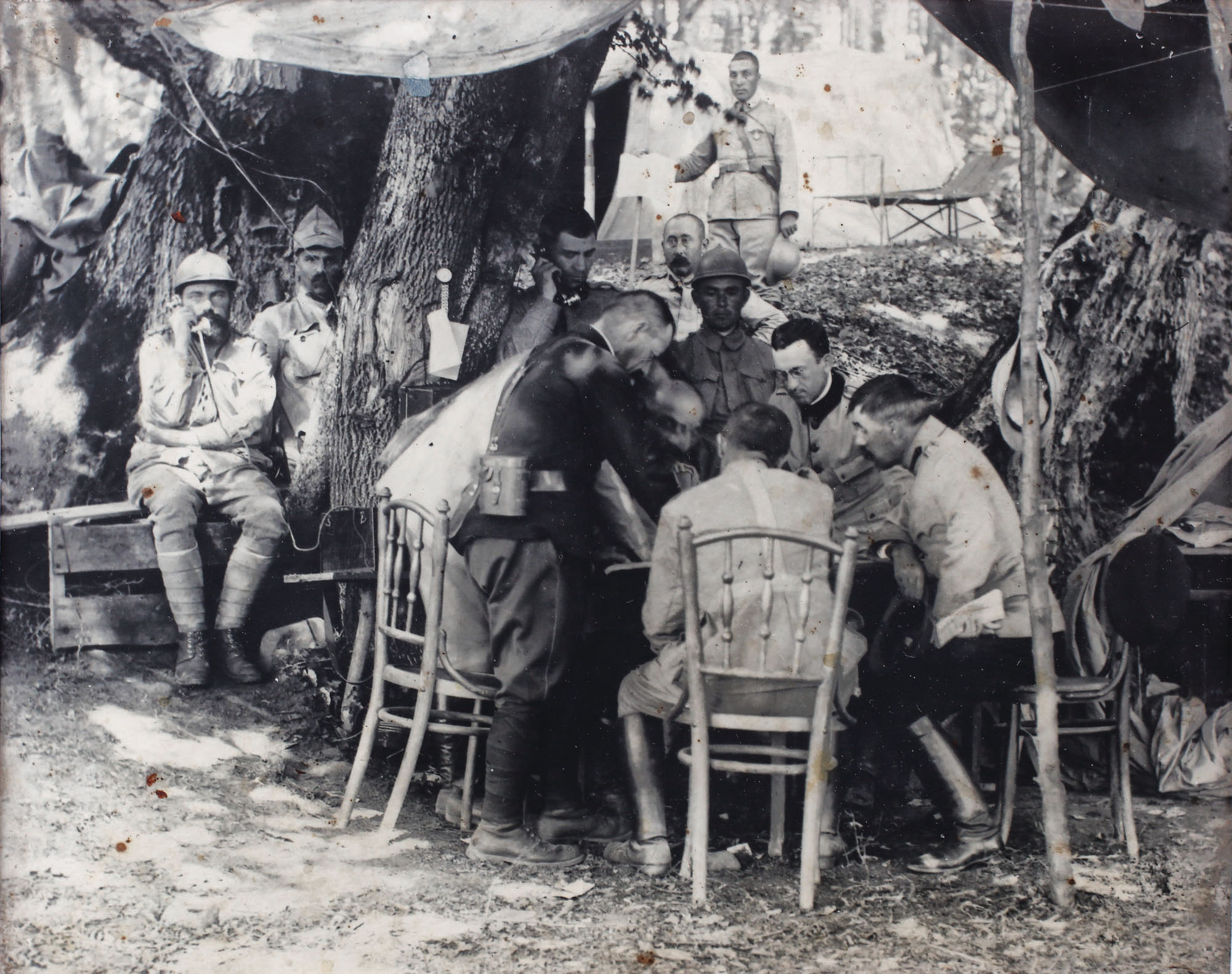 237. "La masă", fotografie de pe front surprinzându-i pe soldaţii români alături de cei francezi, 1916