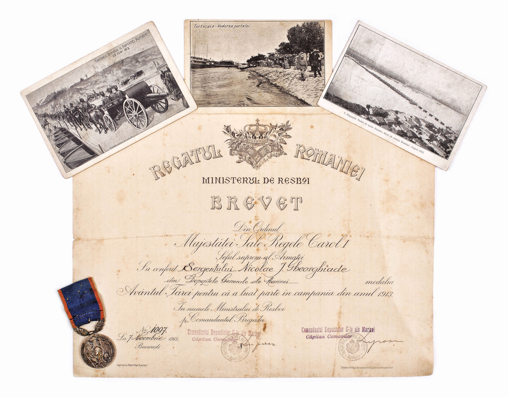 191. Lot format din medalie "Avântul Ţării" însoţită de brevet de acordare şi trei cărţi poştale din timpul celui de-al Doilea Război Balcanic