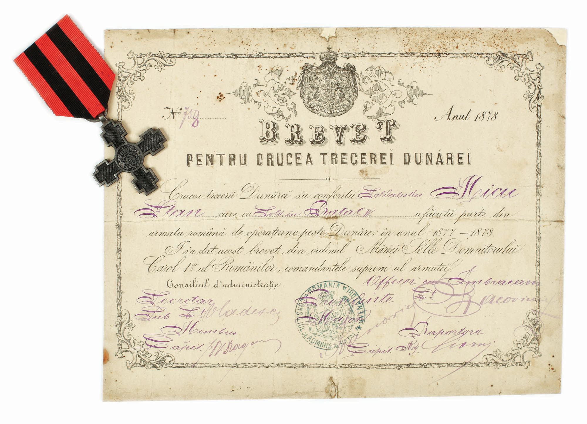 189. Medalia "Trecerea Dunării", însoțită de brevetul de acordare, 1877-1878