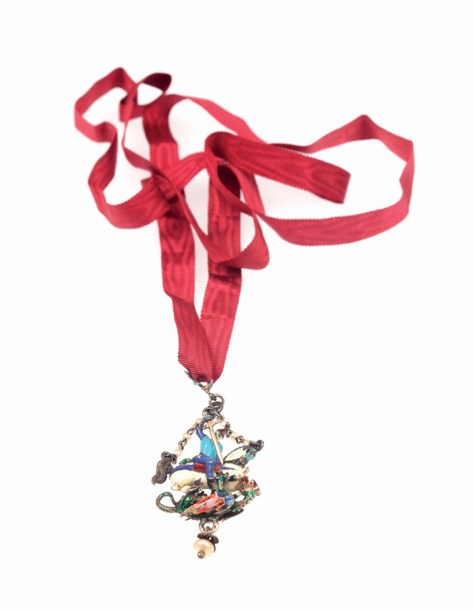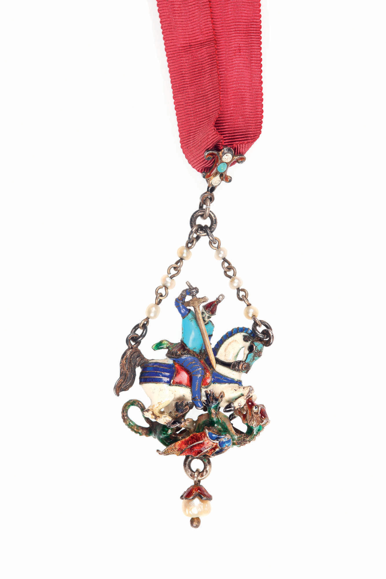 197. Ordinul Jartierei, "The Most Noble Order of the Garter", cel mai înalt ordin cavaleresc britanic, instituit de Regele Eduard al III-lea al Angliei, în 1340, pandantiv realizat din argint, cu email şi perle, piesă extrem de rară, de colecţie