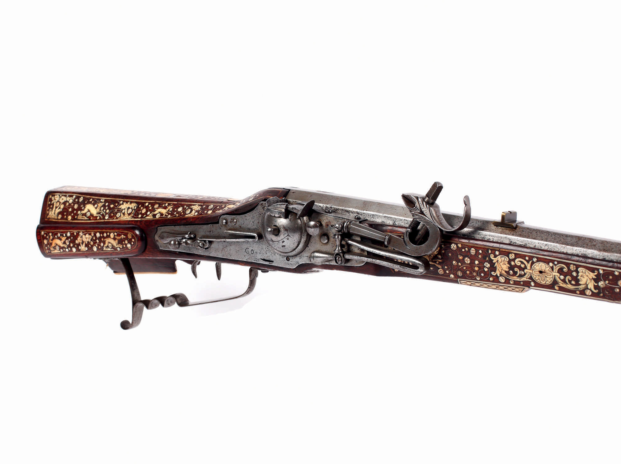 125. Pușcă de vânătoare germană, posibil armurier Hans Stockmann (activ 1590-1639), bogat decorată, sfârșitul sec. XVI. Armă de panoplie