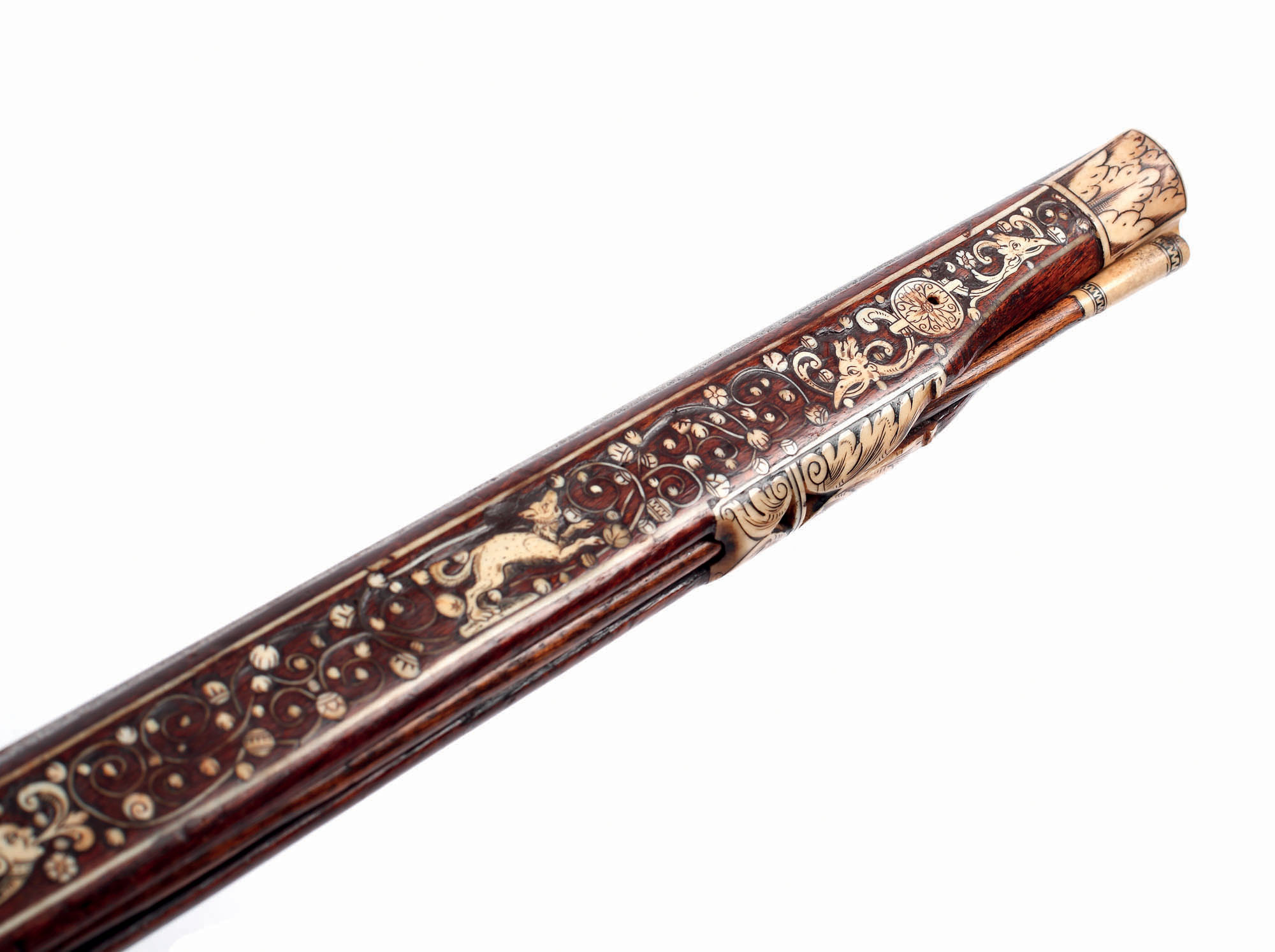 Pușcă de vânătoare, cu cremene și rotiță, cu țeava lisă și bătătorul original, bogat decorată cu scene de vânătoare și motive florale, realizate din os intarsiat în lemn. Mecanismul de dare a focului cu cremene și rotiță, atribuit ca invenție lui Leonardo da Vinci, în jurul anului 1500, a rezolvat problema portului armelor încărcate și gata de executare a focului, fără primejdia ca jarul fitilului să se stingă.