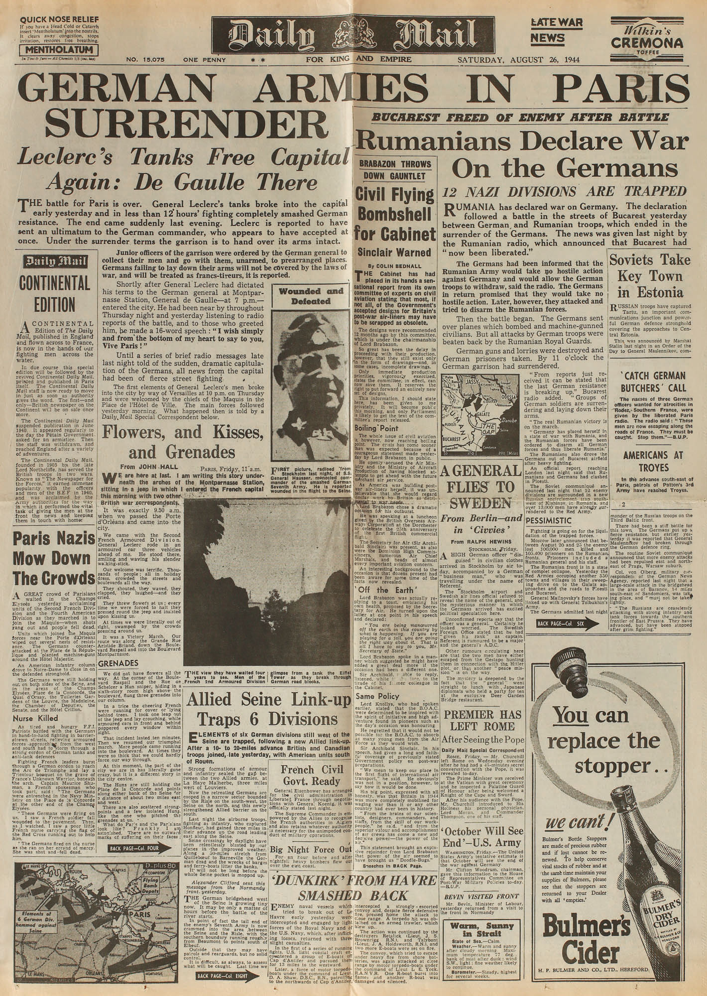 264. Ziarul "Daily Mail", 26 august 1944, anunţă întoarcerea armelor României împotriva Axei
