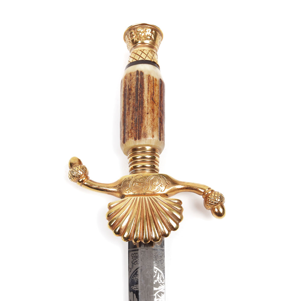 104. Dagă de vânătoare, decorată cu motive cinegetice, inscripţionată cu monograma G.B., sec. XX