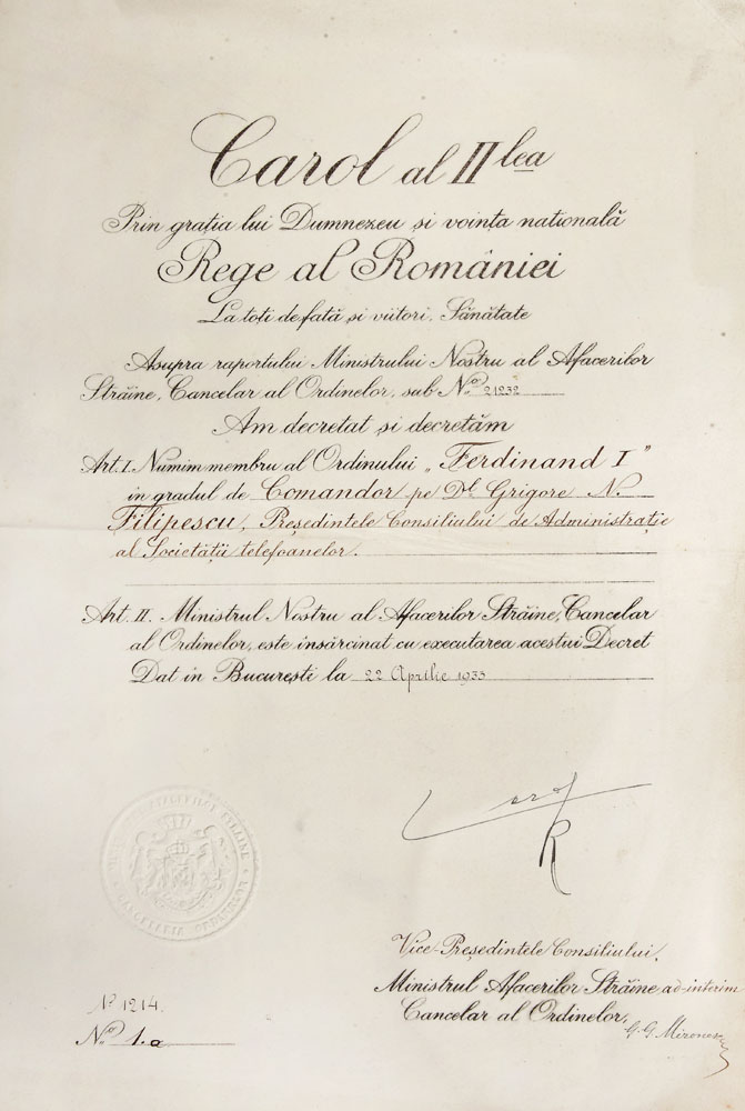196. Decret de acordare a titlului de membru al Ordinului "Ferdinand I" în gradul de Comandor, acordat lui Grigore N. Filipescu , 23 aprilie 1933, cu semnătura olografă a Regelui Carol al II-lea