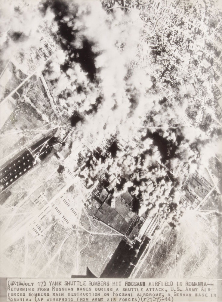 181. Fotografie de presă ilustrând bombardarea de către avioanele americane a bazei germane din Focşani, 19 iulie 1944, însoţită de certificat de autenticitate