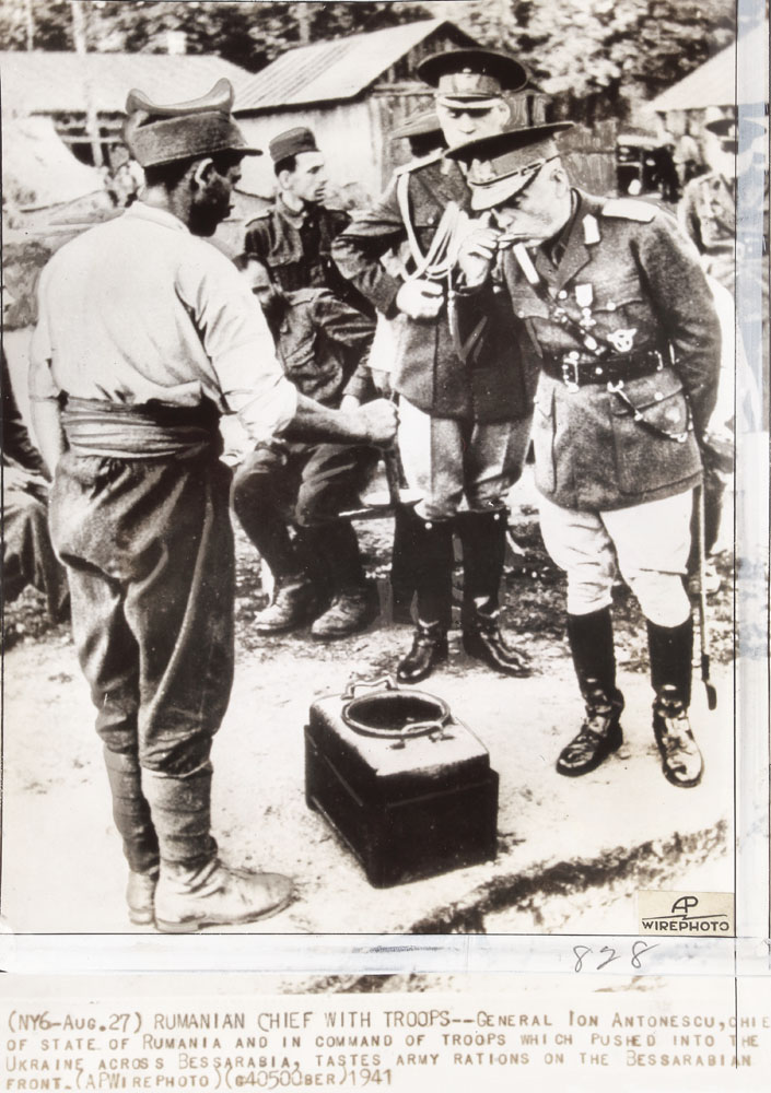 179. Fotografie de presă ilustrându-l pe Generalul Ion Antonescu gustând din raţiile soldaţilor pe frontul basarabean, 28 august 1941, însoţită de certificat de autenticitate