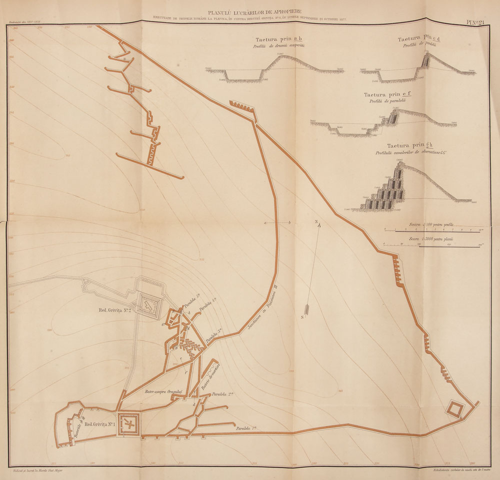 155. Hartă militară "Planul lucrărilor de apropiere executate de trupele române la Plevna, în contra redutei Griviţa 2, în lunile septembrie şi octombrie", realizată de Marele Stat Major, 1877