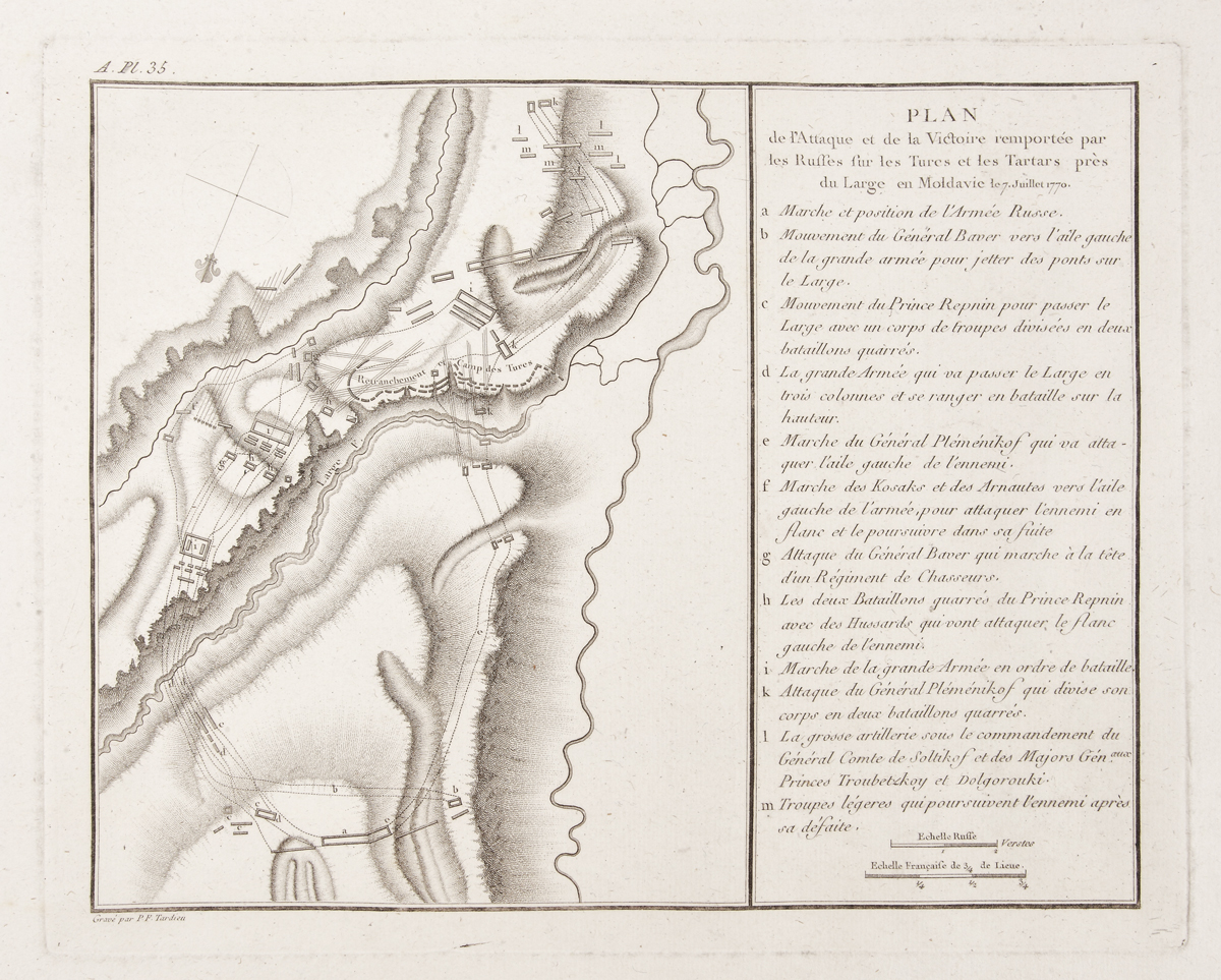 158. Harta "Planul atacului și al victoriei obținute de armata rusă împotriva turcilor și tătarilor lângă Larga, în Moldova, la 7 iulie 1770", de Pierre Francois Tardieu