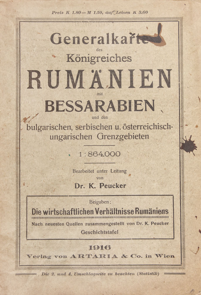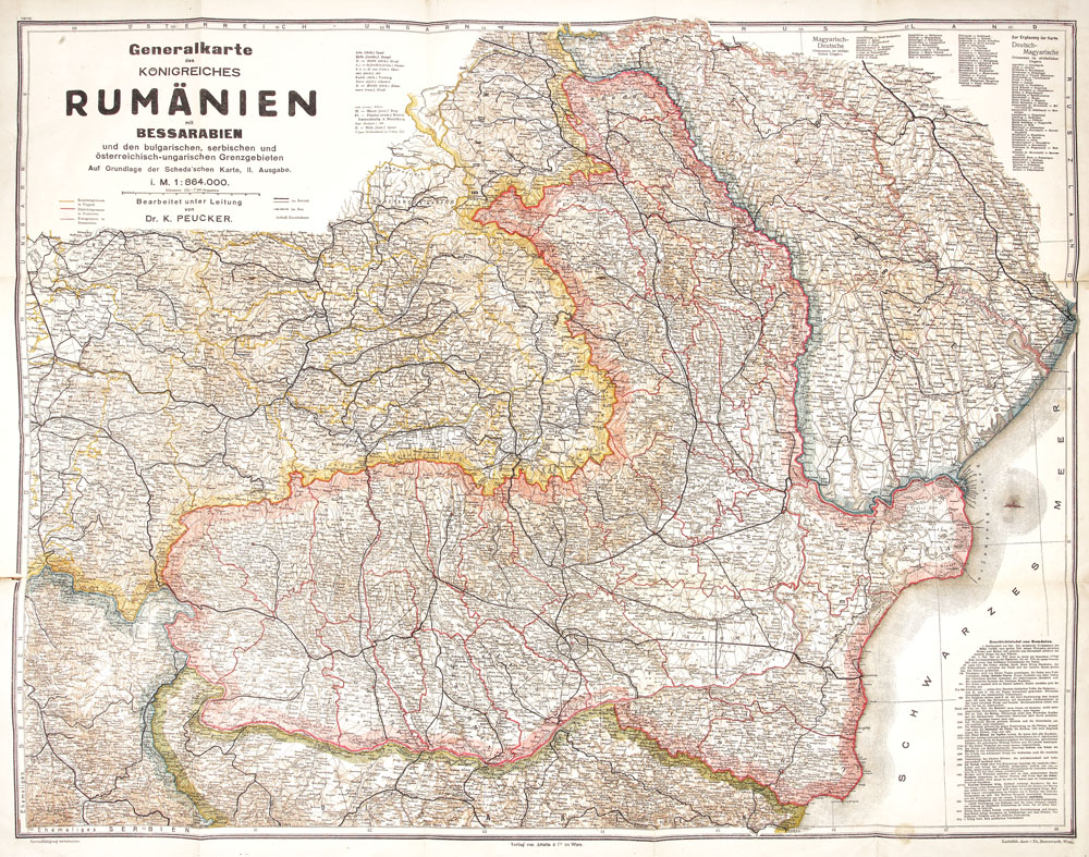 159. Harta "Regatul României şi Basarabia înainte de Primul Război Mondial", realizată de dr. K. Peucker, Viena, 1916