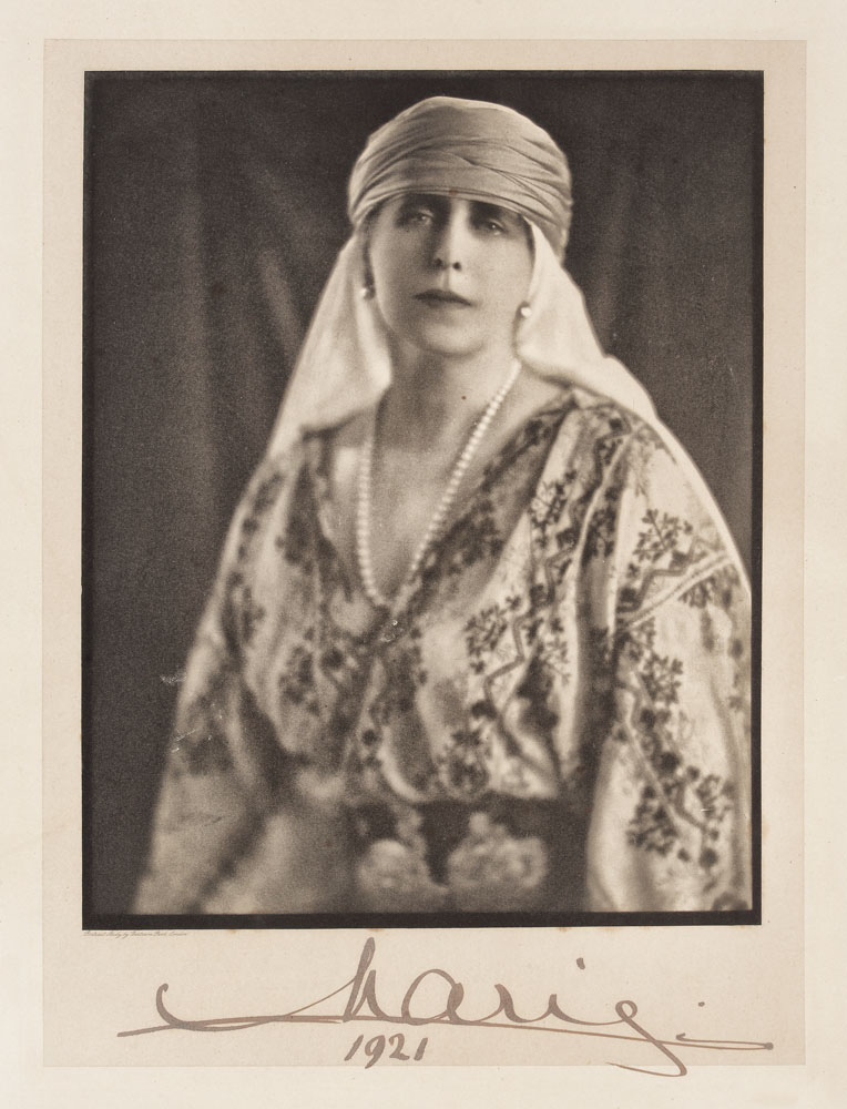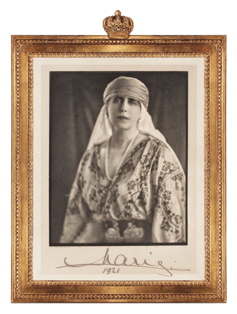 164. Litografie ilustrându-o pe Regina Maria în costum popular, cca. 1921, cu semnătura olografă a reginei [1921]