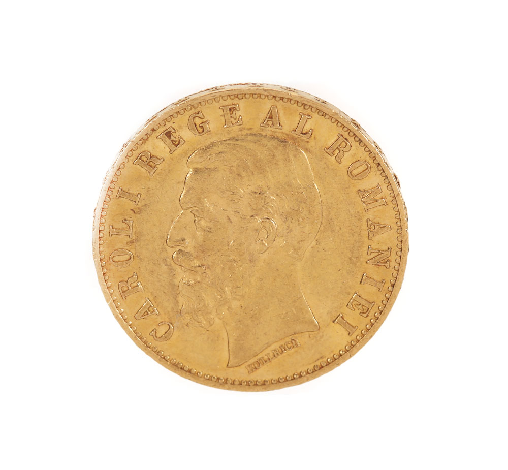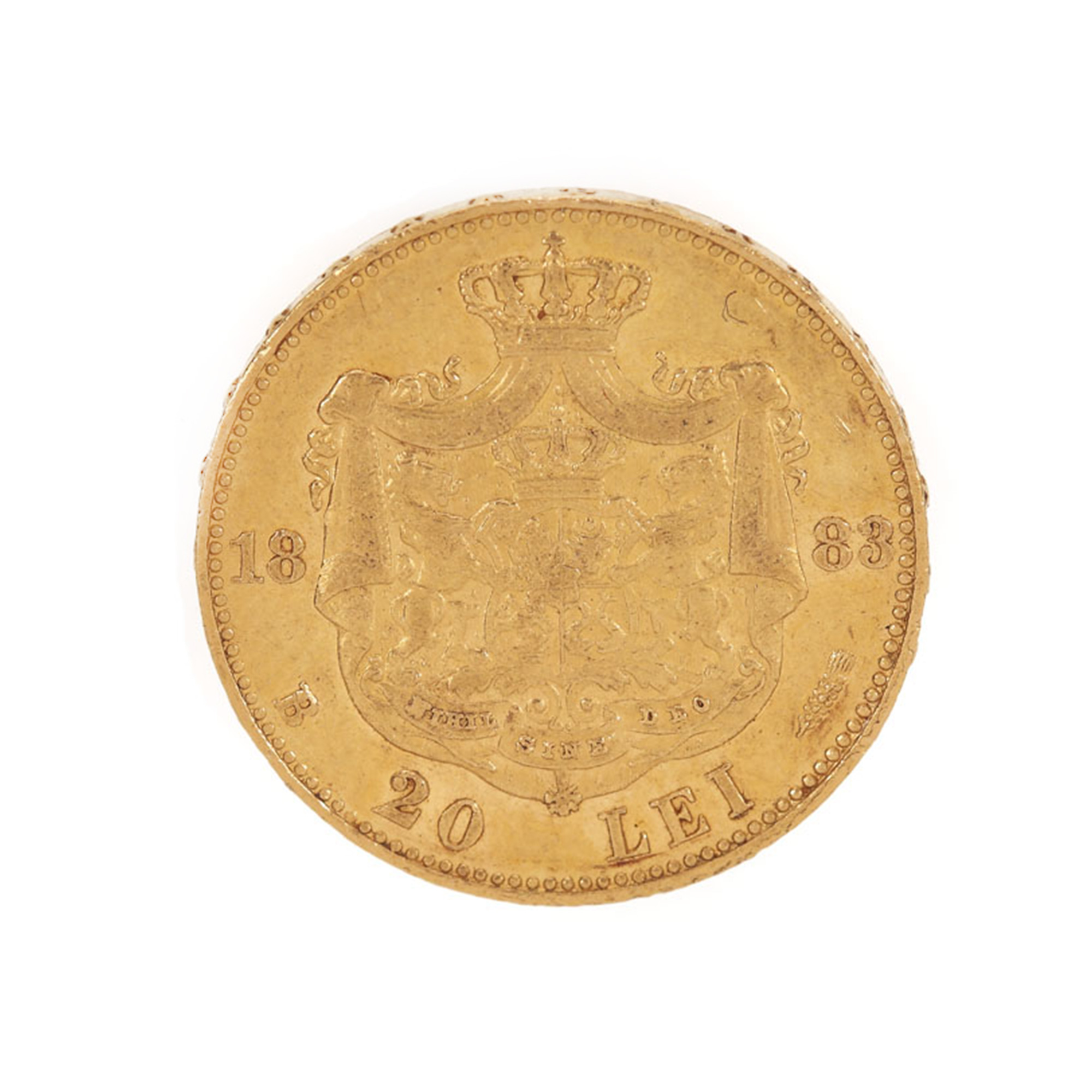 213. Monedă "Carol Rege al României", din aur, 20 de lei, gravor Wilhem Kullrich, 1883