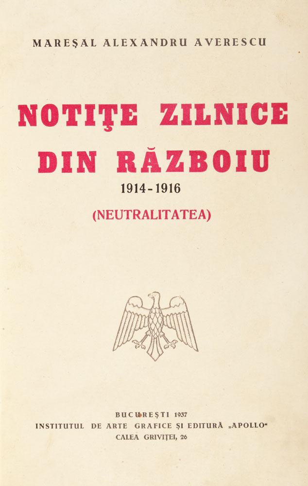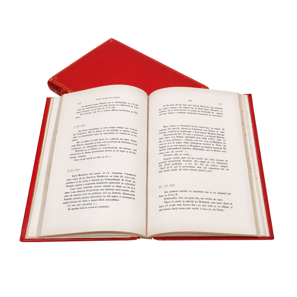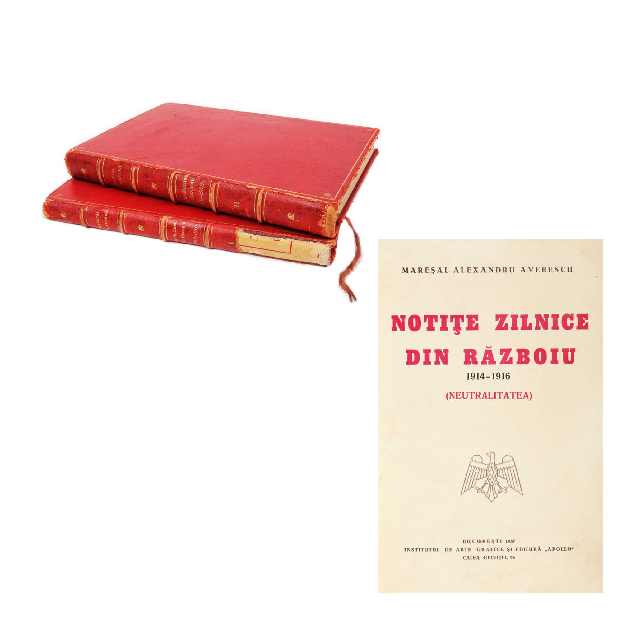 184. "Notiţe Zilnice din Războiu", de Mareşalul Alexandru Averescu, două volume, ediţie de lux, cu dedicaţia acestuia, 1937, de colecţie