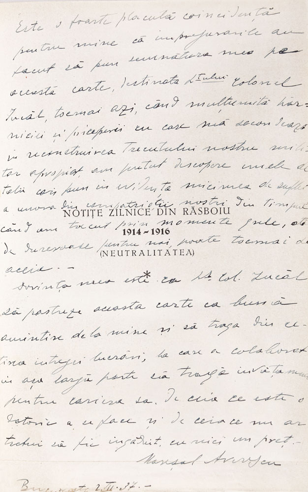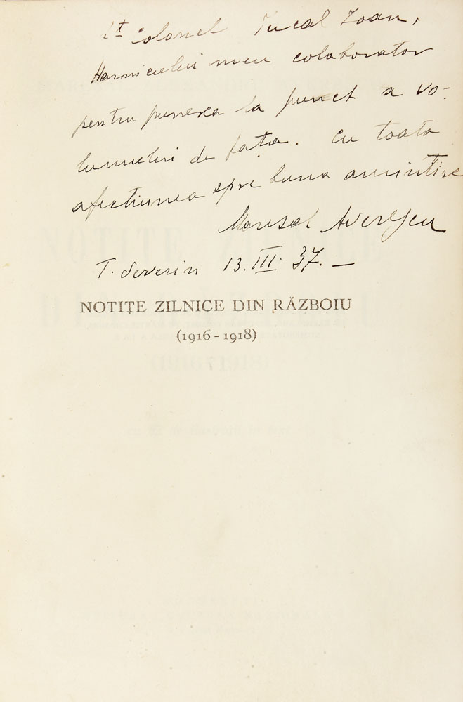 Volumele sunt tipărite pe o hârtie de calitate superioară. Primul volum cuprinde o dedicaţie a mareşalului Alexandru Averescu către un camarad de arme din Războiul pentru reîntregirea neamului: "Este o foarte plăcută coincidenţă pentru mine că împrejurările au făcut să pun semnătura mea pe această carte, destinată d-lui colonel Iucăl, tocmai azi, când mulţumită hărniciei şi priceperii cu care mă secondează în reconstruirea trecutului nostru militar apropiat, am putut descoperi unele detalii care pun în evidenţă micimea de suflet a unora din compatrioţii noştri din timpul când am trecut prin momente grele, atât de dureroase pentru noi, poate tocmai de aceea... Dorinţa mea este ca d-ul colonel Iucăl să păstreze această carte ca bună amintire de la mine şi să tragă din citirea întregii lucrări, la care a colaborat în aşa largă parte învăţăminte pentru cariera sa. De ceea ce este o datorie a se face şi de ceea ce nu ar trebui să fie îngăduit, cu nici un preţ, Mareşal Averescu 2 III 37". Al doilea volum face parte din cele 126 de exemplare, nepuse în comerţ, tipărite pe hârtie Chamois, având numărul 17. Şi acest volum cuprinde o dedicaţie adresată aceluiaşi camarad de arme: "D-lui colonel Iucăl Ioan, Harnicului meu colaborator pentru punerea la punct a volumului de faţă. Cu toată afecţiunea spre bună amintire Mareşal Averescu T [urnu] Severin 13 III 37" Tânărul ofiţer Ioan Iucăl, în vârstă de 22 de ani s-a distins pe câmpul de luptă de la Mărăşti, fiind decorat cu ordinele "Coroana României" şi "Steaua României". S-a remarcat în luptele de eliberare după 23 august 1944, Oarba de Mureş cât şi în cele de eliberare a Ungariei şi Cehoslovaciei, fiind decorat cu ordinul "Mihai Viteazul". În urma acestor fapte este numit general de brigadă, iar în 1947 Ioan Iucăl a fost numit general de divizie. Colonel (r) Constantin Chiper, "Veterani în slujba patriei", Vol. I, Sub egida Asociaţiei Naţionale Cultul Eroilor, 2005