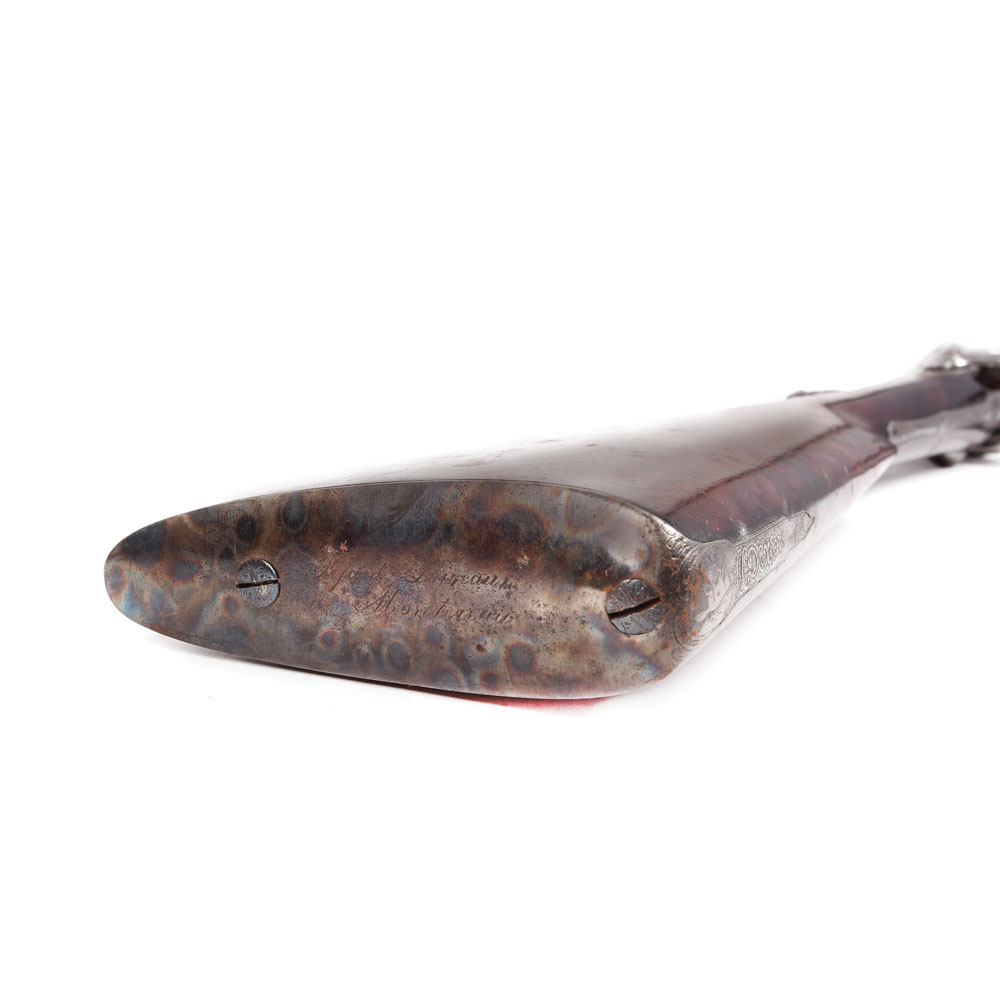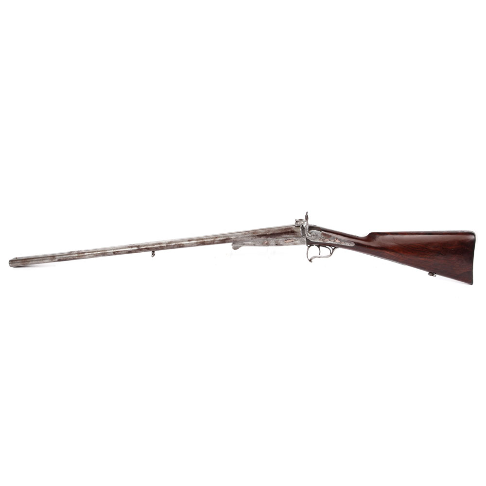 Pușcă de vânătoare, cu percuție, cu 2 țevi lise din oțel de damasc, atelier francez, sfârșitul sec XIX.