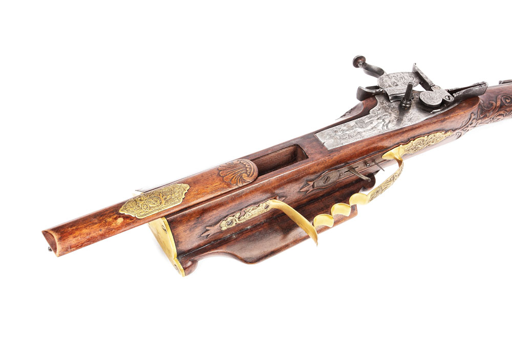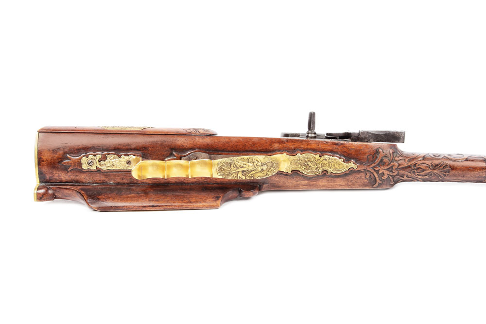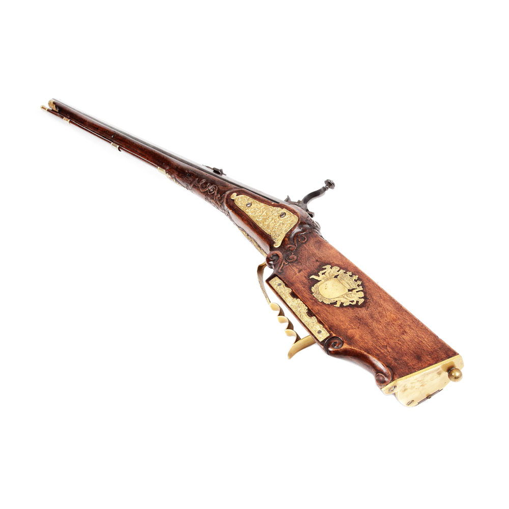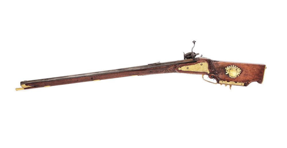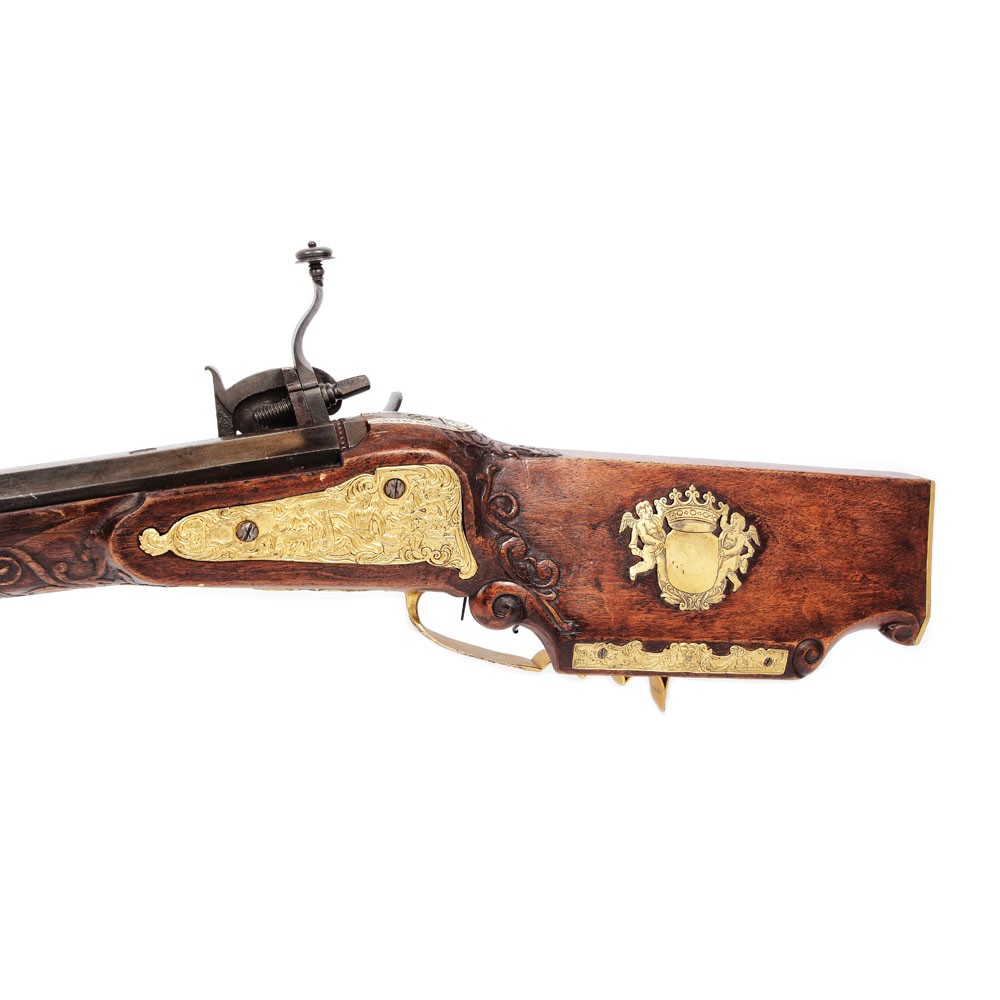 Pușcă de vânătoare, cu mecanism cu cremene și rotiță, cu o țeavă ghintuită și bătător original, cu înălțător fix cu crestătură, începutul sec. XVIII. Pe partea dreapta, platina, din bronz doree, decorată cu scene de vânătoare. Pe pat diverse decorațiuni din bronz. Mecanismul gravat cu scenă de vânătoare.