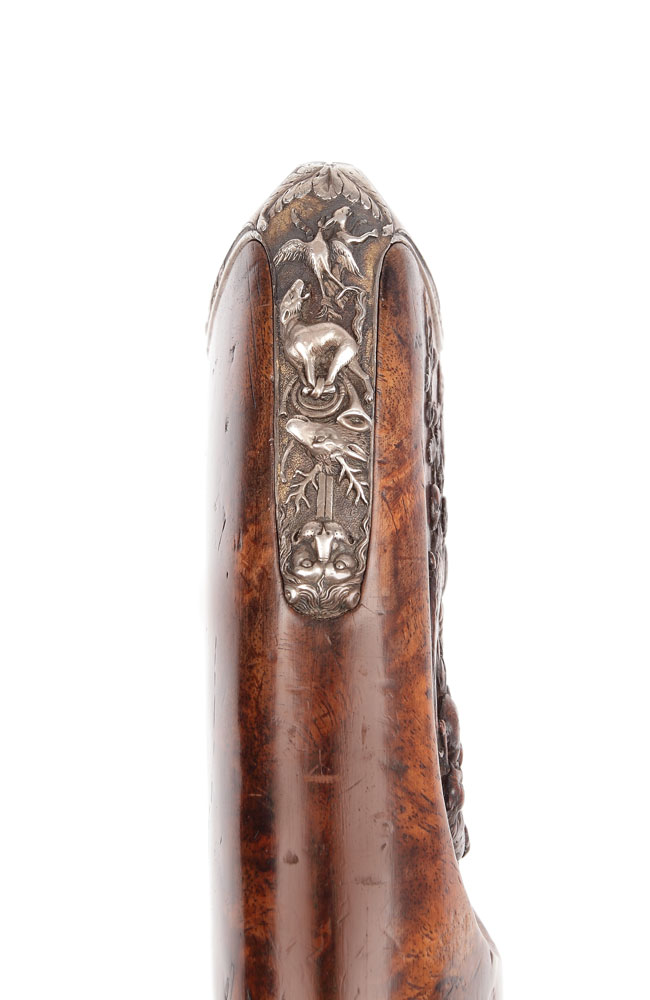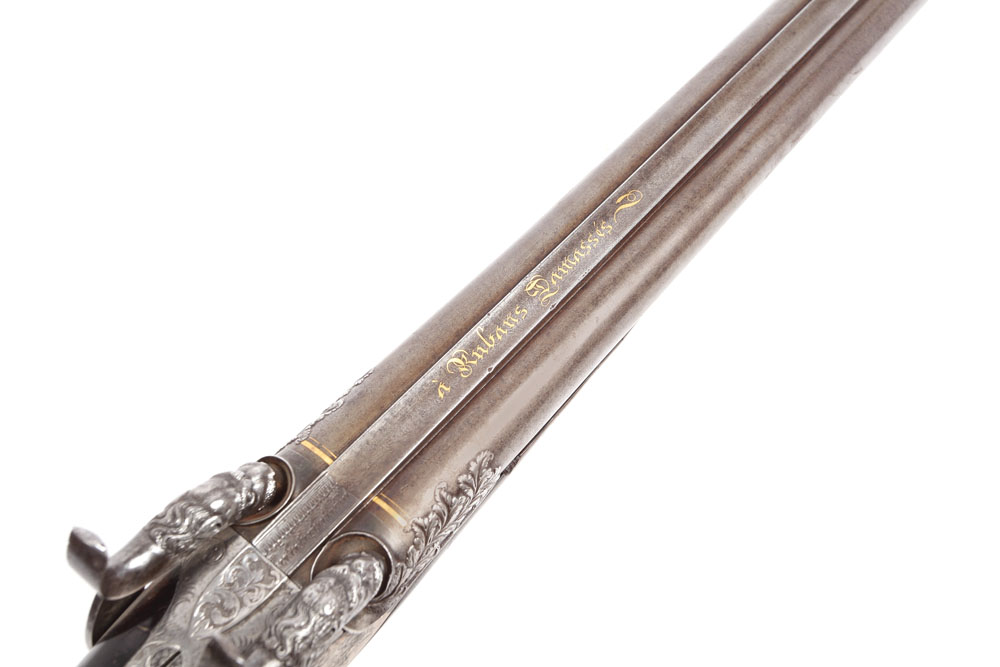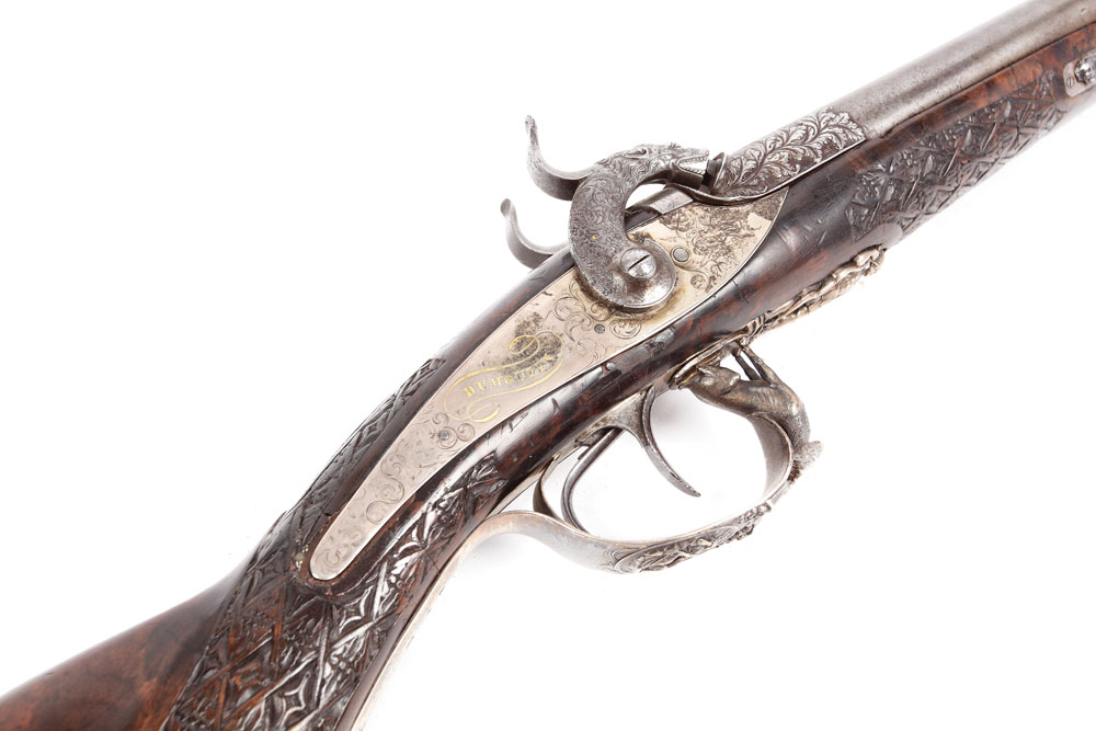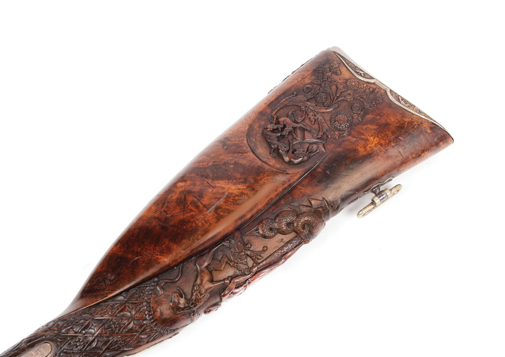 107. Pușcă de vânătoare, Dumoulin a Rouen, bogat decorată cu scene de vânătoare, sfârșitul sec. XIX. Armă de panoplie