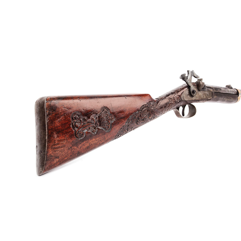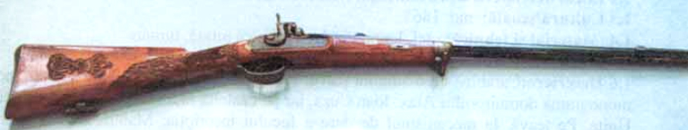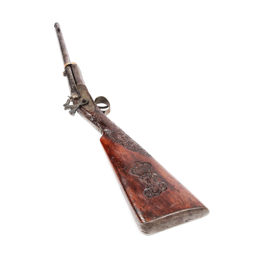Pușcă de vânătoare, Manufactura Română, cu monogramă princiară a lui Alexandru Ioan Cuza, cu capsă, cu o țeavă lisă. Pe platina stângă, inscripția Manufactura Română. Pe țeavă, monograma AC. Pe pat, gravat în lemn, monogramă princiară AC.