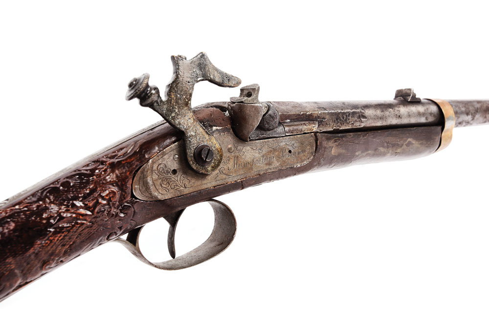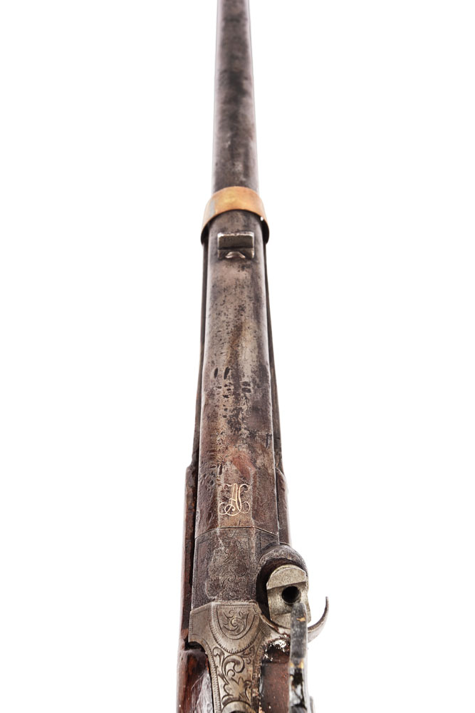 106C. Pușcă de vânătoare, Manufactura Română, purtând pe țeavă monograma princiară aurită a lui Alexandru Ioan Cuza, mijlocul sec. XIX. Armă de panoplie