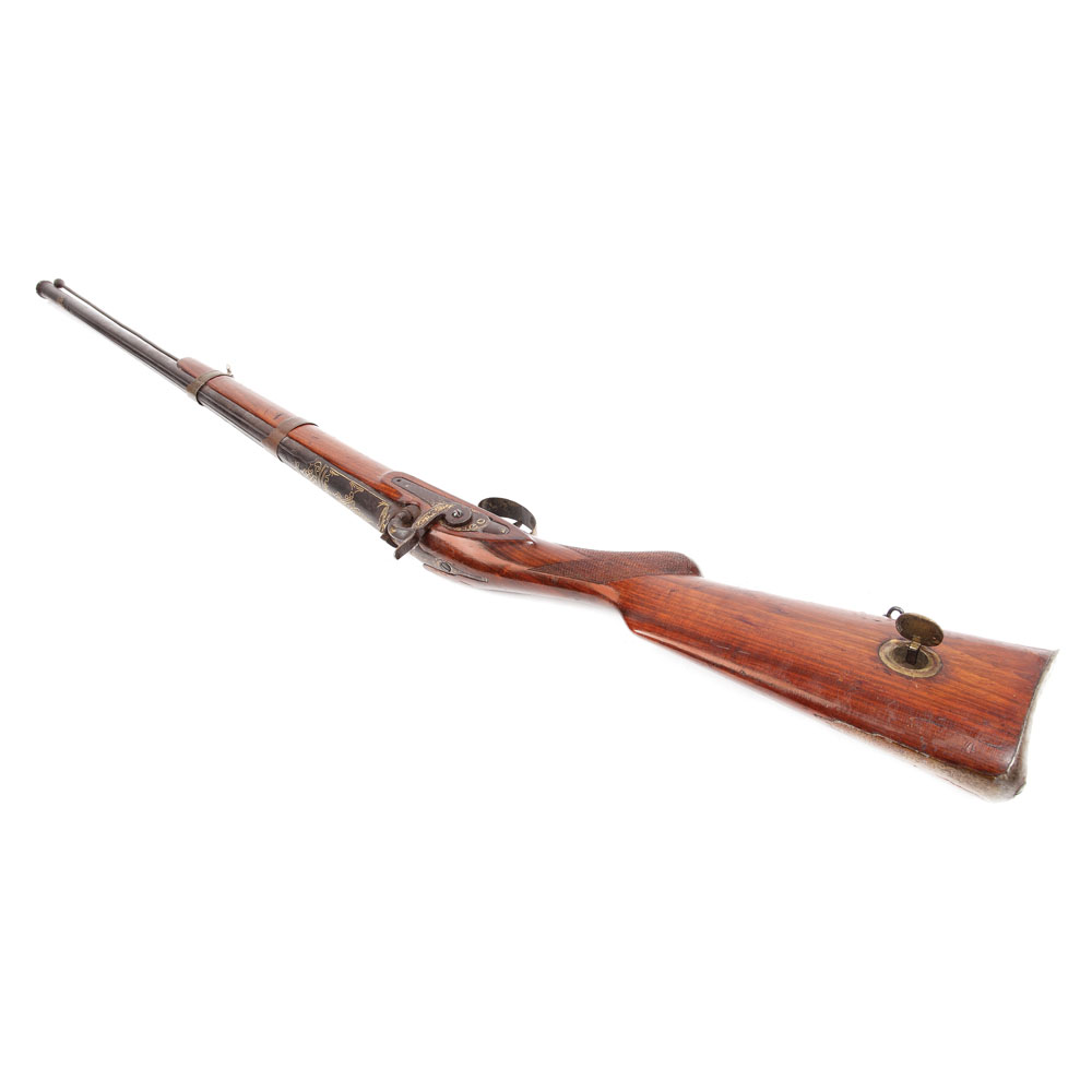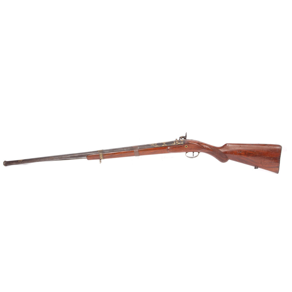 Pușcă de vânătoare, cu capsă, cu o țeavă lisă din oțel de damasc și bătător original, prima jumătate a sec. XIX. Inscripționată cu un blazon scarletat și cu coroană regală, indescifrabil.