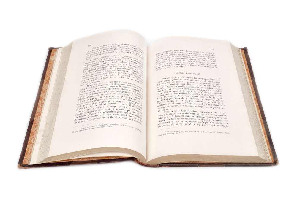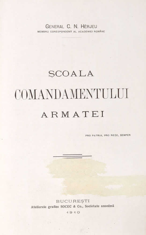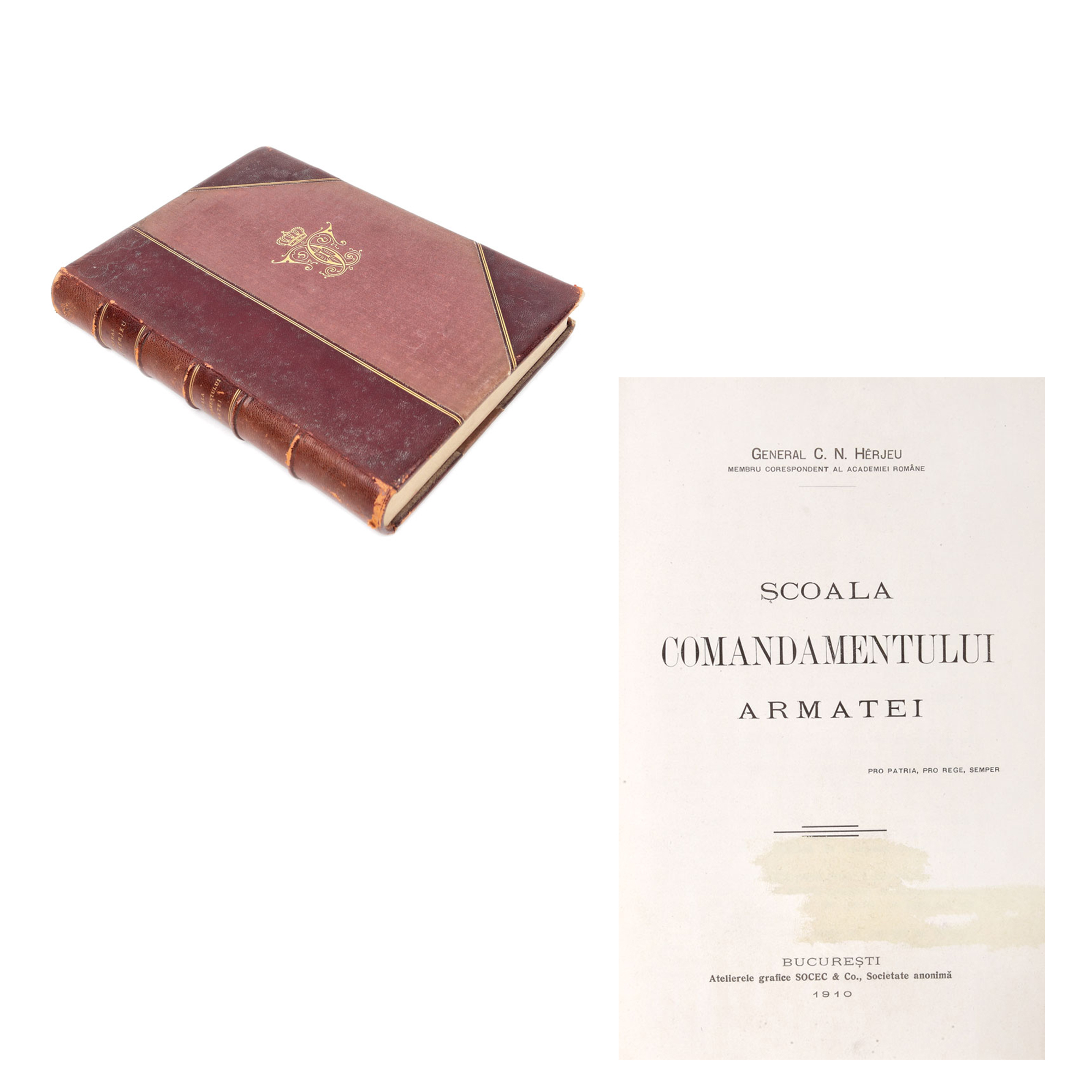 186. "Şcoala comandamentului armatei", de general C.N. Herjeu, volumul este legat cu piele, cu cifrul aurit al Regelui Carol I, București, 1910