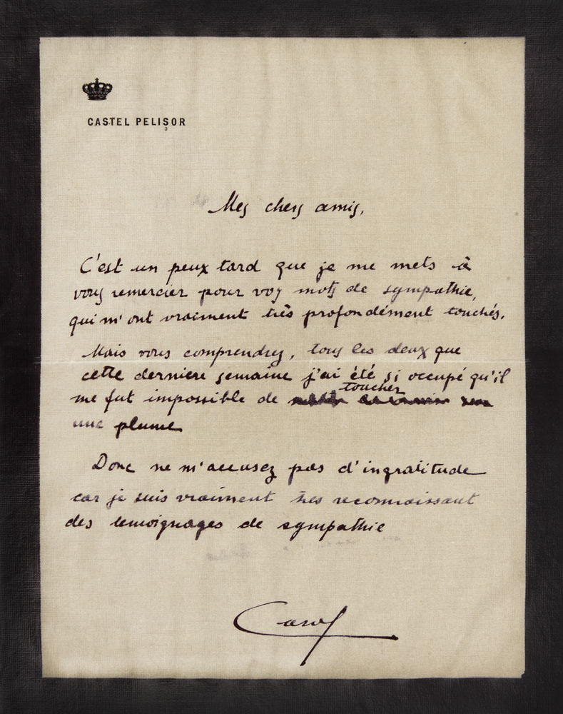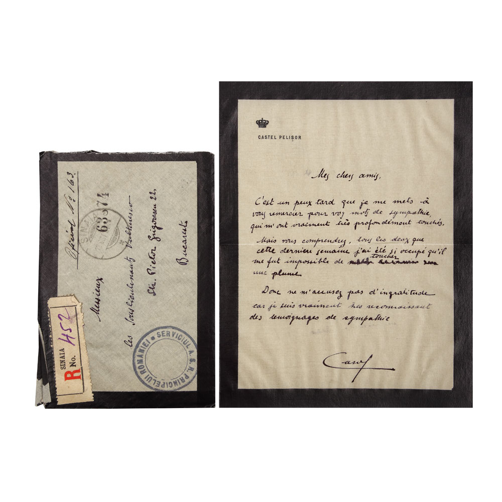 195. Scrisoare olografă de curtoazie trimisă de principele Carol II către sublocotenenţii Nicolae şi Grigore Vulturescu, cu plicul original, scrisă pe hârtie de doliu şi cu stampila "Serviciul A.S.R. Principelui României", Pelișor, 19 octombie 1914