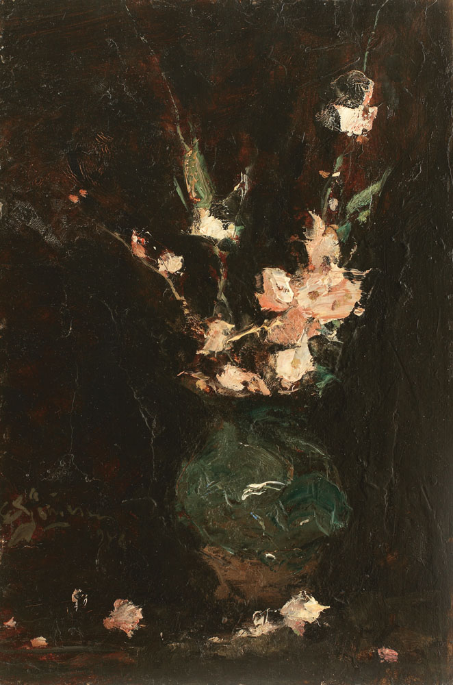 Recunoscut mai ales pentru calităţile sale de mare portretist - în opinia unor critici „cel mai mare” - Eustaţiu Stoenescu a făcut parte dintr-o generaţie de oameni extraordinari ai culturii româneşti, de la Jean Al. Steriadi, Samuel Mützner, Camil Ressu, Nicolae Dărăscu până la Tudor Arghezi şi Nicolae Titulescu, ultimul dintre aceştia fiindu-i şi prieten foarte bun, încă din perioada copilăriei. Mediul intelectual elevat şi ambientul familiei înstărite în care se născuse reprezintă câteva din coordonatele personalităţii sale artistice şi morale, la care se adaugă indubitabilul talent, manifestat la o vârstă foarte fragedă, alături de pictorul francez Leopold Durand Durangel (1828-1898), cunoscut în casa părinţilor săi. Un capitol aparte în opera lui Eustaţiu Stoenescu îl constituie naturile moarte şi florile. Realizate într-un registru cromatic concentrat pe câteva culori, în tonalităţi stinse, fără menţionări specifice ale detaliilor, într-un stil dezinvolt, cu mişcări rapide de penel, ele sunt dovada unei măiestrii şi a unei viziuni artistice de excepţie. Pictate cu „sufletul” – aşa cum spunea cândva Luchian – florile lui Stoenescu oglindesc natura şi trăsăturile umane ale pictorului. Asimilarea totală a operei sale depinde foarte mult de înțelegerea acestui gen pictural abordat de Stoenescu. Îmbătătoare prin natura lor, simboluri impetuoase ale dragostei, păcii şi senzualităţii, florile de măr reprezintă motivul ce a stat la baza creării prezentei opere. Aşezate în ulcica de pământ şi profilate pe fundalul întunecat, florile de măr sunt structurate în materie picturală densă, înnobilată de folosirea culorii roz diafan. Pictorul lucrează spontan, aşezând culoarea suculentă, cu uşoare împăstări succesive, ce dezvăluie o artă plină de seducţie. (M.N.)