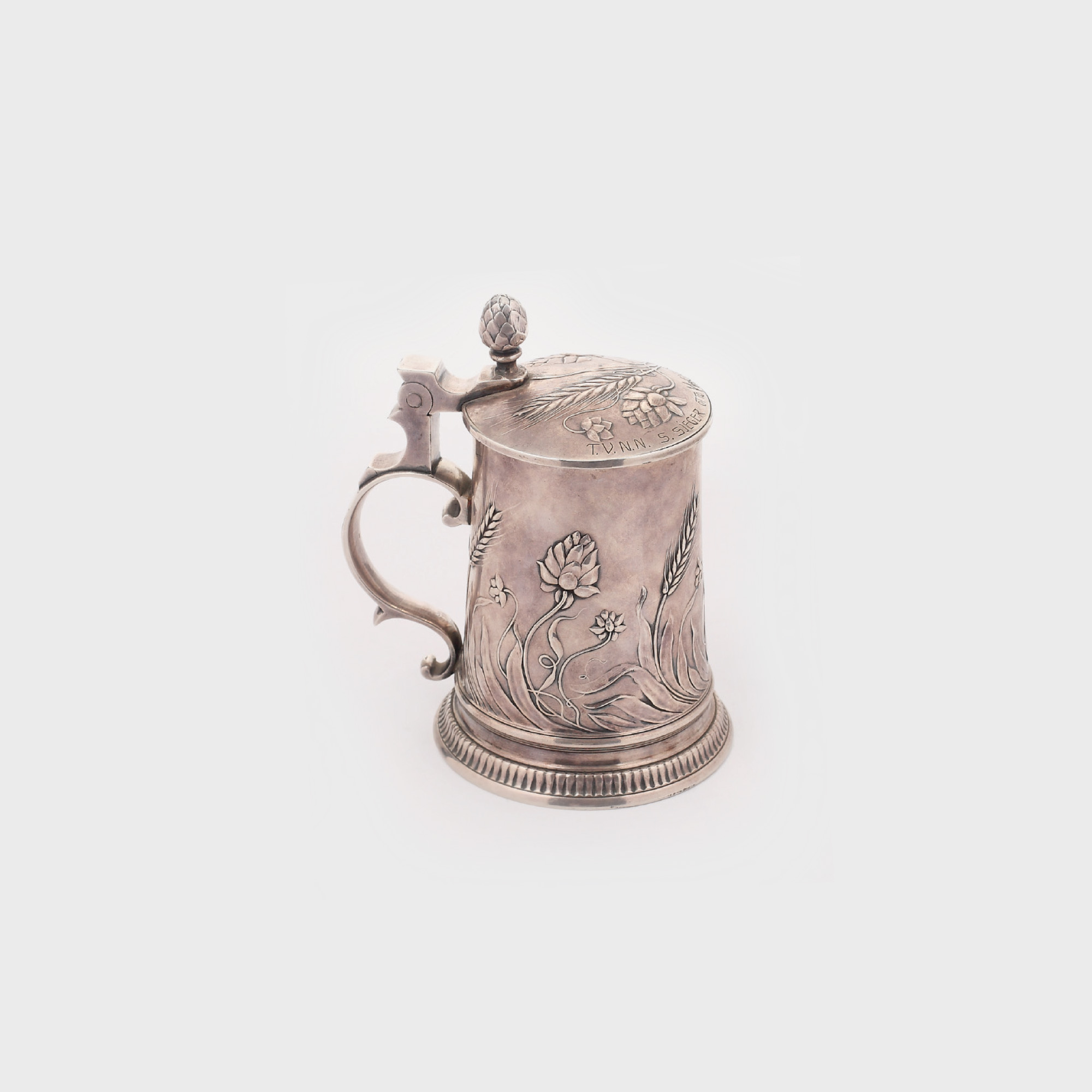Cană de bere cu capac, de tip german tradițional, cu decor adaptat stilului Art Nouveau, cu motive vegetale și florale (caprifoi, spice de grâu). Pe capacul prins în șarnieră gravură "T.V.N.N/S.Sieger/ Otto Wagner".