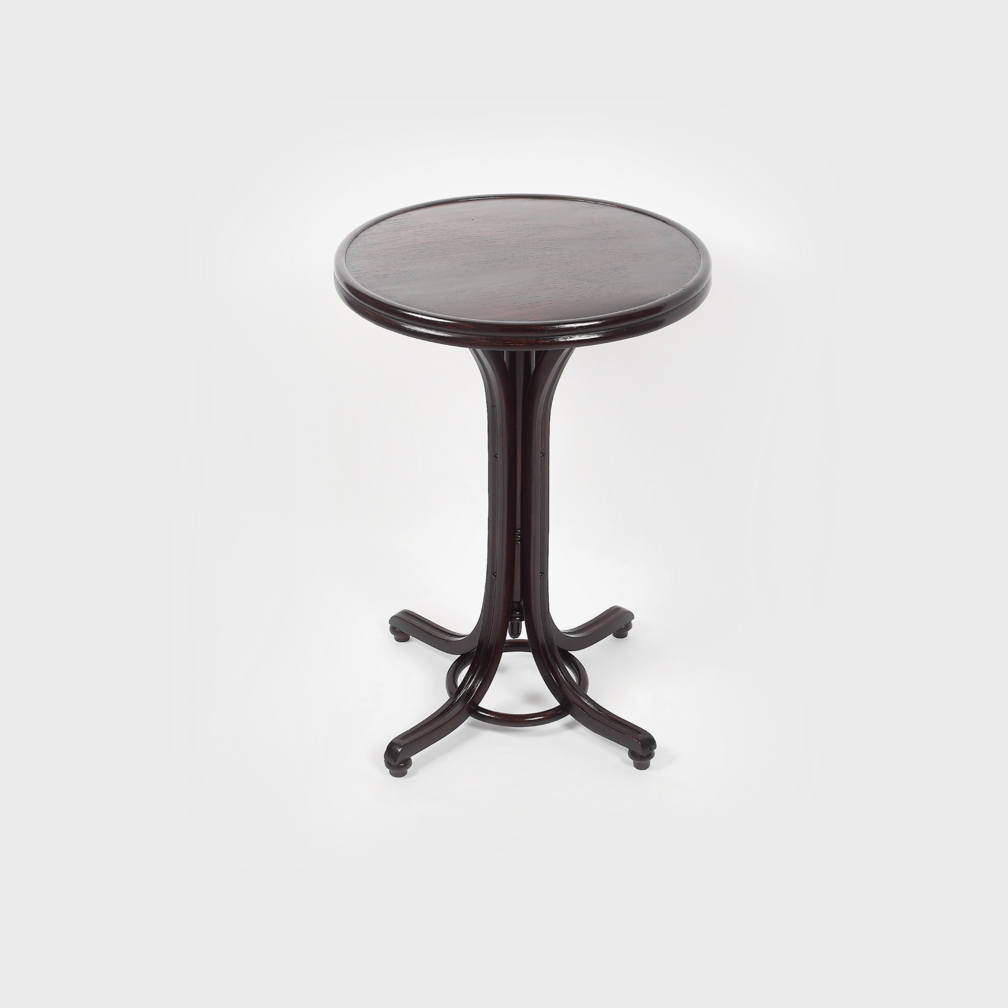 Măsuță rotundă susținută de patru baghete curbate, adosate unui montant strunjit, inferior unite de un motiv circular. Blatul rotund are ramă lată mulurată. Piesă restaurată recent.