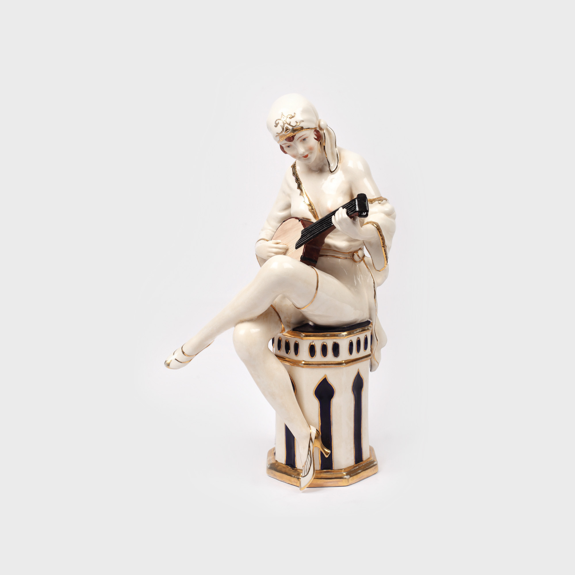 122. Statuetă din porţelan Royal Dux, în stil Art Deco, reprezentând o frumoasă cântăreață la mandolină, cca. 1930