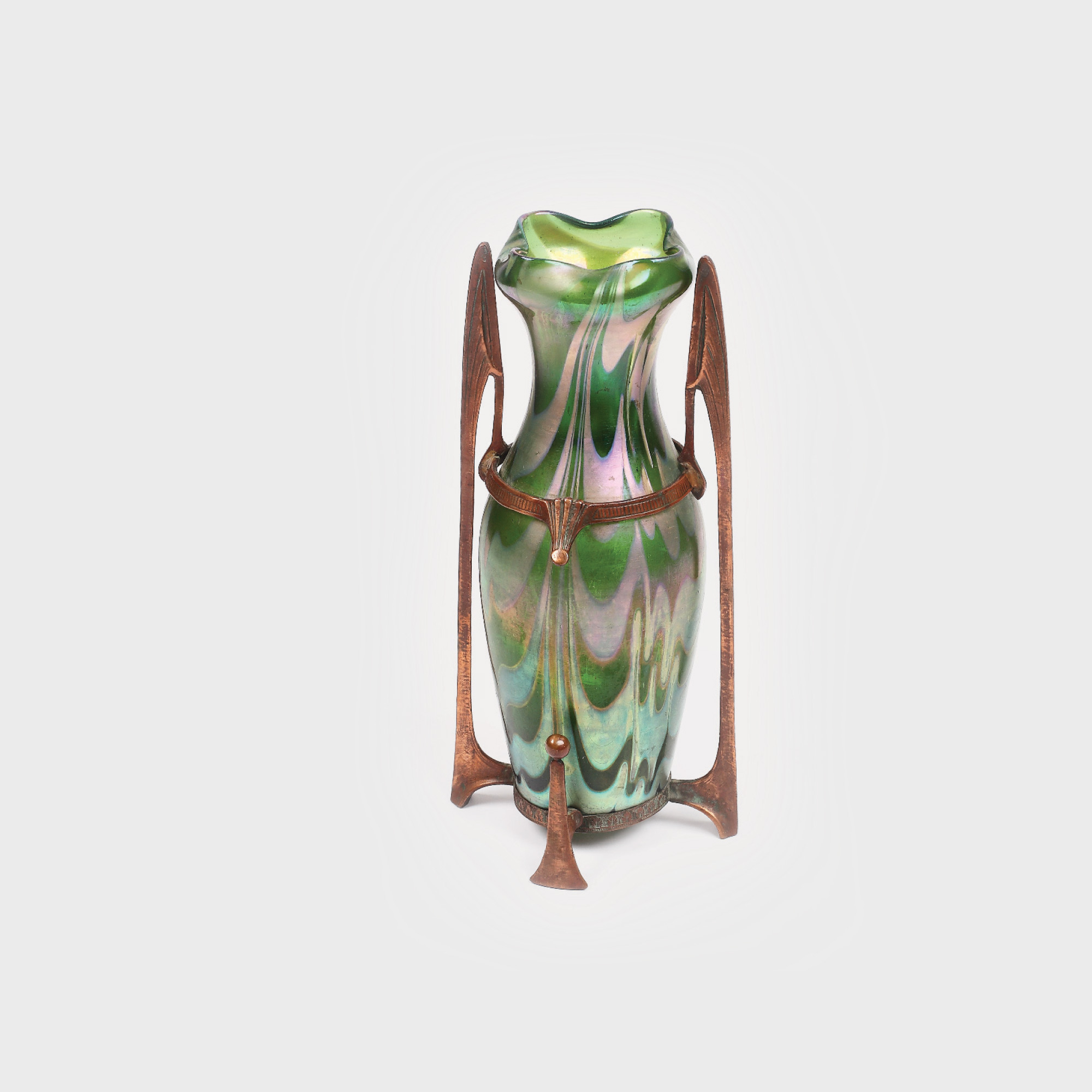 110. Vas decorativ din sticlă modelată tip Loetz, montată în suport metalic ornat cu palmete [Începutul sec. XX]