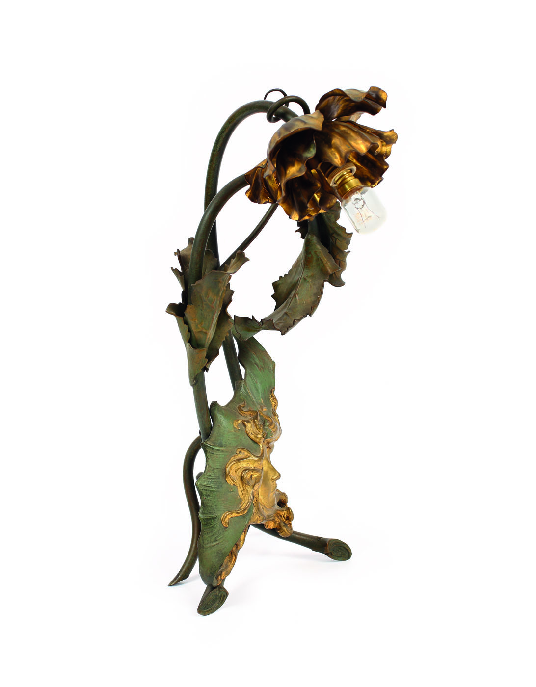 Lampă de masă, pe picior tripod format din ramuri vegetale, susținând frunze cu efigie feminină și lumină corolă de floare. În stil Art Nouveau.