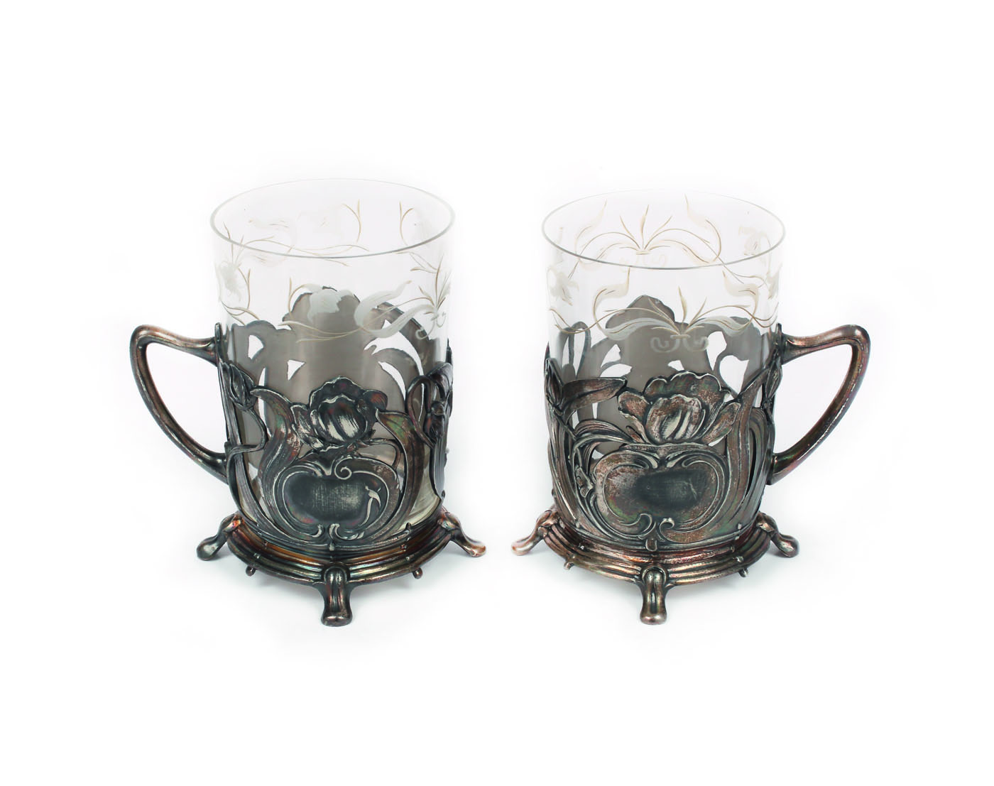 Pereche de pahare din sticlă, cu decor gravat motive florale, în suport metalic ajurat, cu cartușe convenționale și lalele. În stil Jugendstil.
