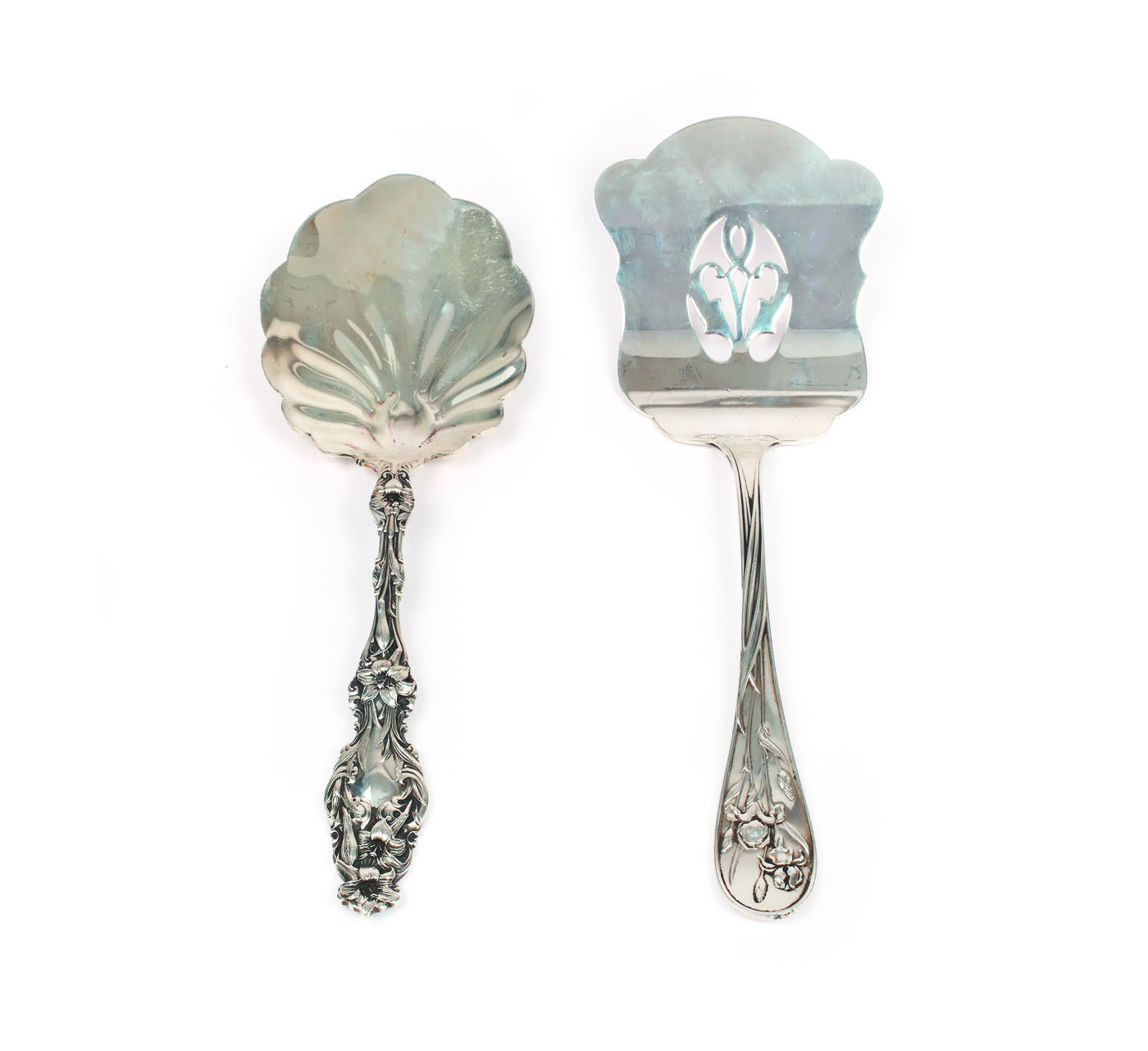 Lot format din paletă cu căuș în formă de scoică, cu mâner bogat decorat cu tije și flori de crin şi paletă cu decor ajurat central și mâner cu decor în relief buchet de iriși. În stil Art Nouveau.